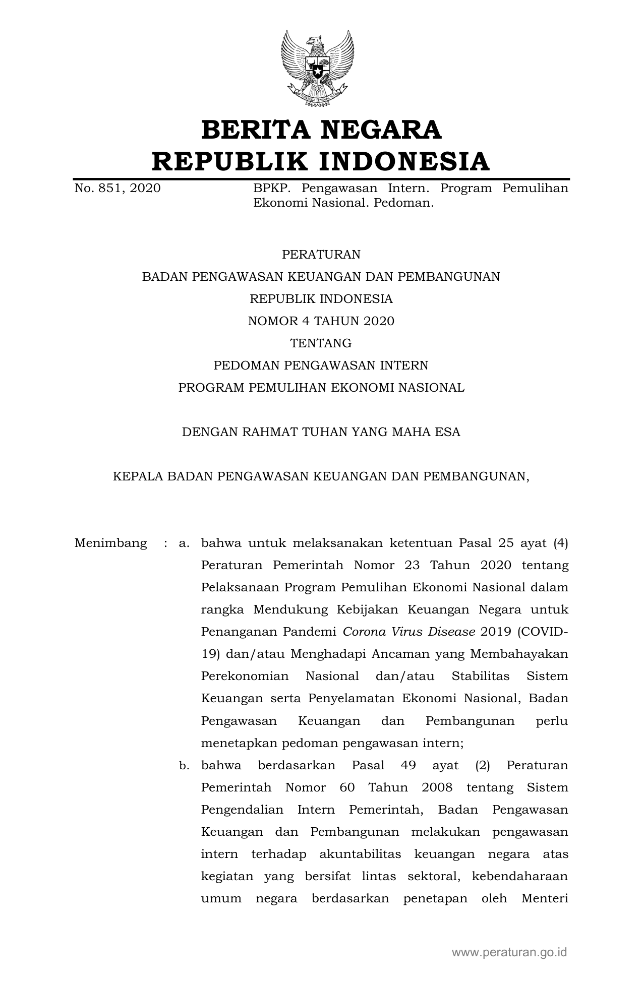 PERBAN Nomor 4 Tahun 2020 | Peraturan Badan Nomor 4 Tahun 2020 tentang PEDOMAN PENGAWASAN INTERN PROGRAM PEMULIHAN EKONOMI NASIONAL