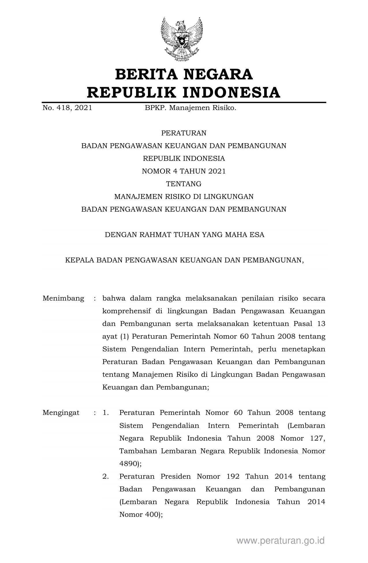 PERBAN Nomor 4 Tahun 2021 | Peraturan Badan Nomor 4 Tahun 2021 tentang MANAJEMEN RISIKO DI LINGKUNGAN BADAN PENGAWASAN KEUANGAN DAN PEMBANGUNAN