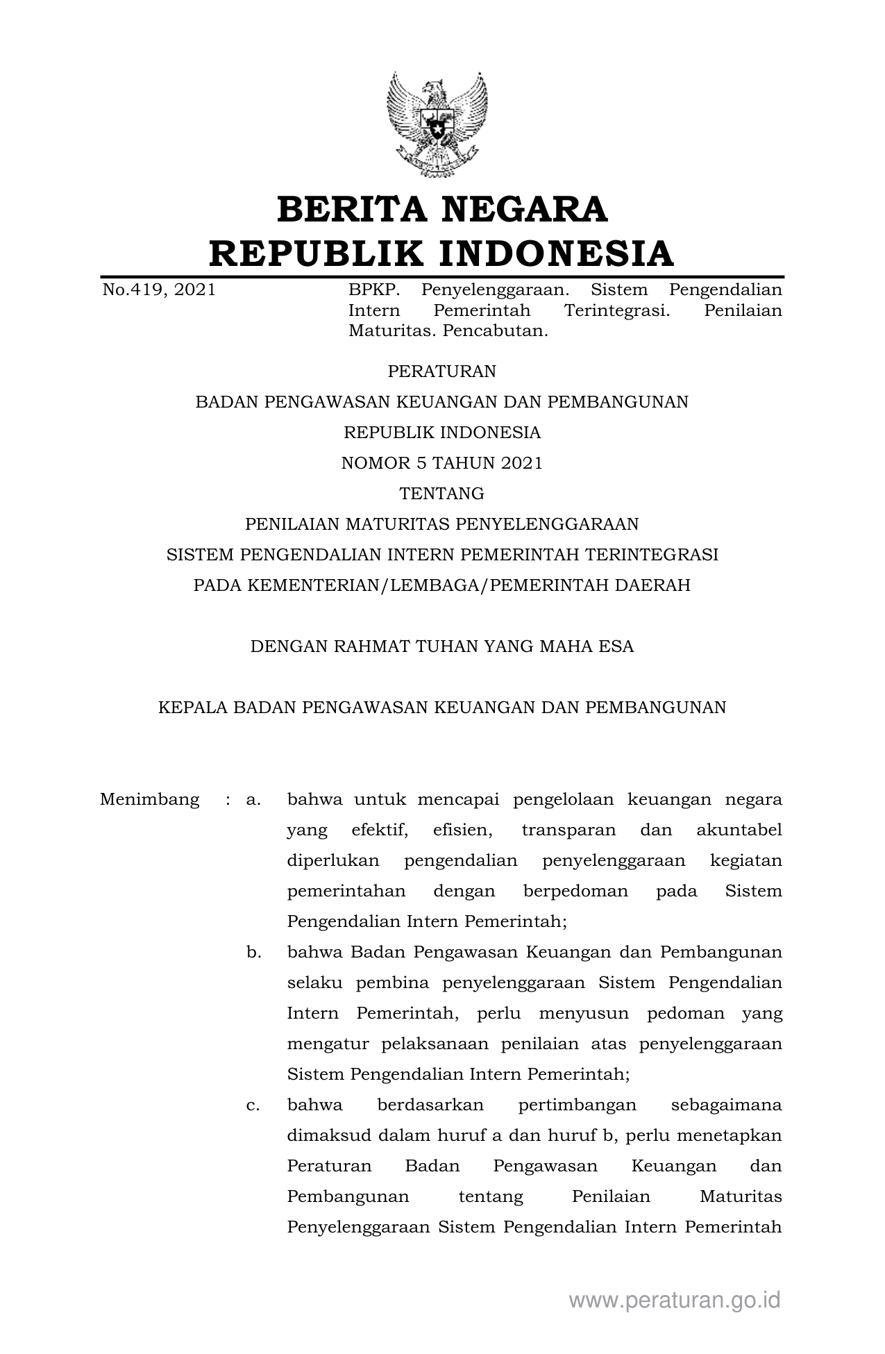 PERBAN Nomor 5 Tahun 2021 | Peraturan Badan Nomor 5 Tahun 2021 tentang PENILAIAN MATURITAS PENYELENGGARAAN SISTEM PENGENDALIAN INTERN PEMERINTAH TERINTEGRASI PADA KEMENTERIAN/LEMBAGA/PEMERINTAH DAERAH
