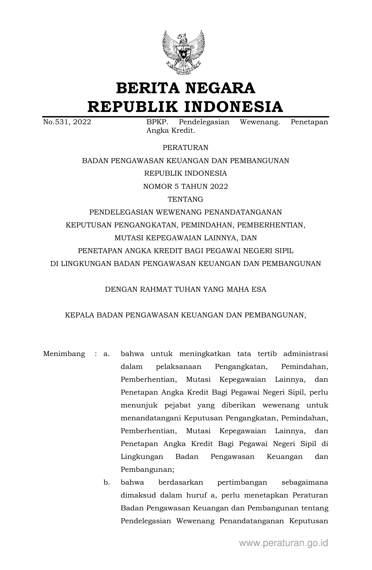 PERBAN Nomor 5 Tahun 2022 | Peraturan Badan Nomor 5 Tahun 2022 tentang PENDELEGASIAN WEWENANG PENANDATANGANAN KEPUTUSAN PENGANGKATAN, PEMINDAHAN, PEMBERHENTIAN, MUTASI KEPEGAWAIAN LAINNYA, DAN PENETAPAN ANGKA KREDIT BAGI PEGAWAI NEGERI SIPIL DI LINGKUNGAN BADAN PENGAWASAN KEUANGAN DAN PEMBANGUNAN
