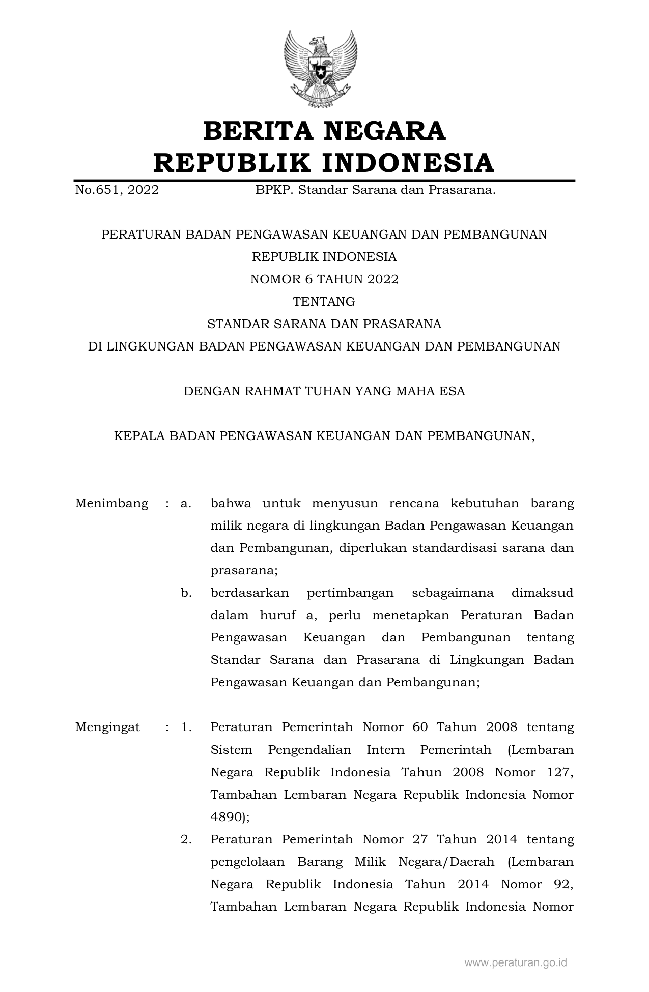 PERBAN Nomor 6 Tahun 2022 | Peraturan Badan Nomor 6 Tahun 2022 tentang STANDAR SARANA DAN PRASARANA DI LINGKUNGAN BADAN PENGAWASAN KEUANGAN DAN PEMBANGUNAN