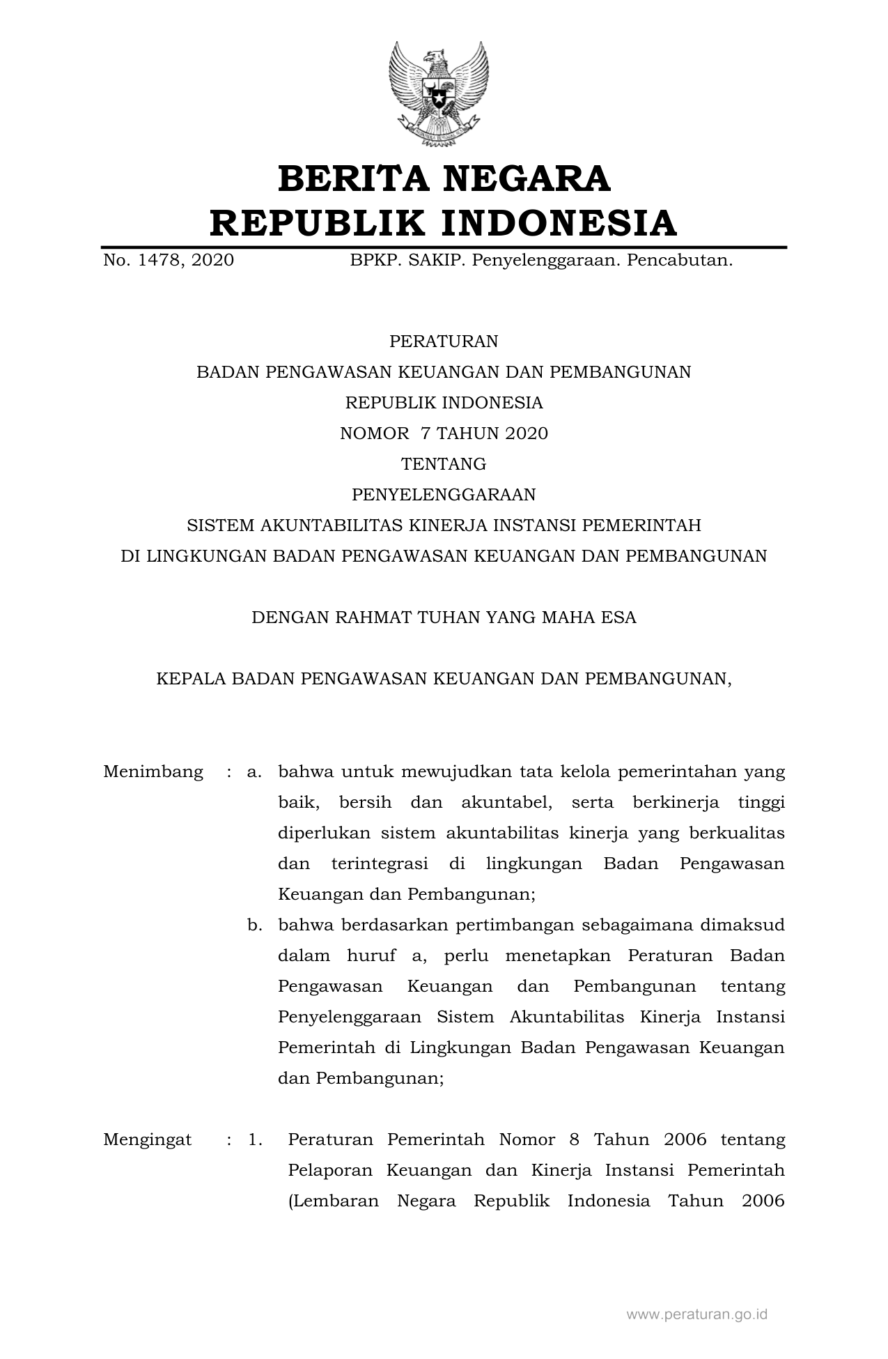 PERBAN Nomor 7 Tahun 2020 | Peraturan Badan Nomor 7 Tahun 2020 tentang PENYELENGGARAAN SISTEM AKUNTABILITAS KINERJA INSTANSI PEMERINTAH DI LINGKUNGAN BADAN PENGAWASAN KEUANGAN DAN PEMBANGUNAN