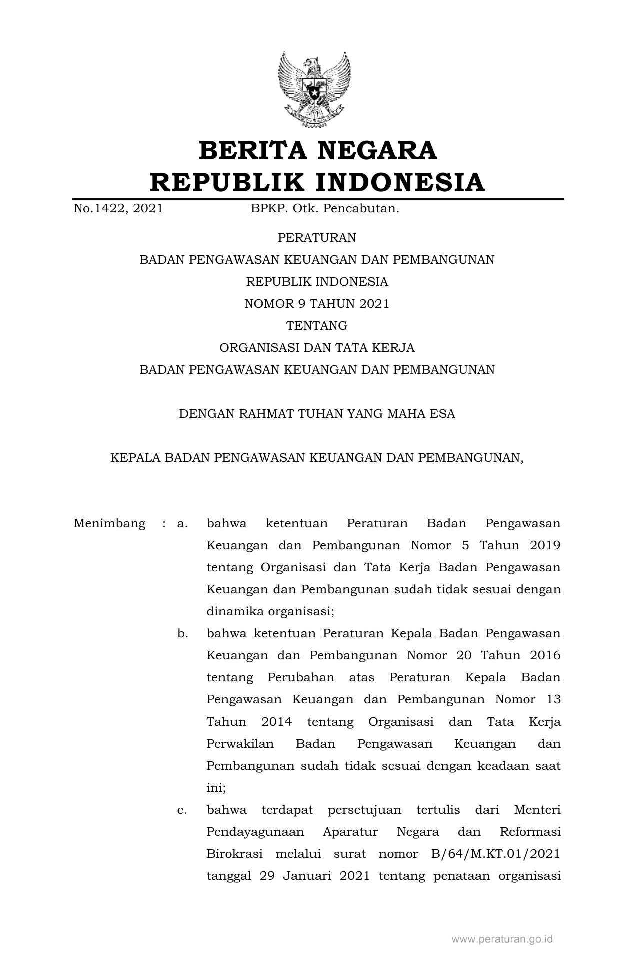 PERBAN Nomor 9 Tahun 2021 | Peraturan Badan Nomor 9 Tahun 2021 tentang ORGANISASI DAN TATA KERJA BADAN PENGAWASAN KEUANGAN DAN PEMBANGUNAN
