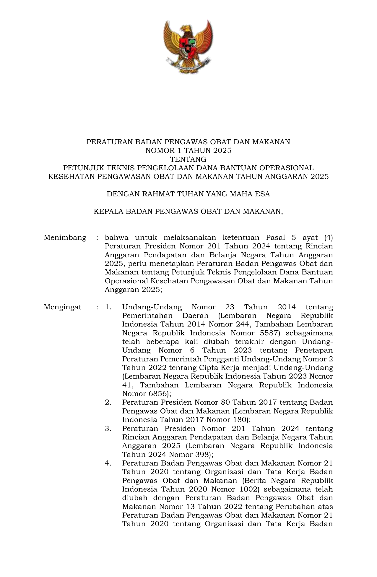 PERBAN Nomor 1 Tahun 2025 | Peraturan Badan Nomor 1 Tahun 2025 tentang Petunjuk Teknis Pengelolaan Dana Bantuan Operasional Kesehatan Pengawasan Obat dan Makanan Tahun Anggaran 2025