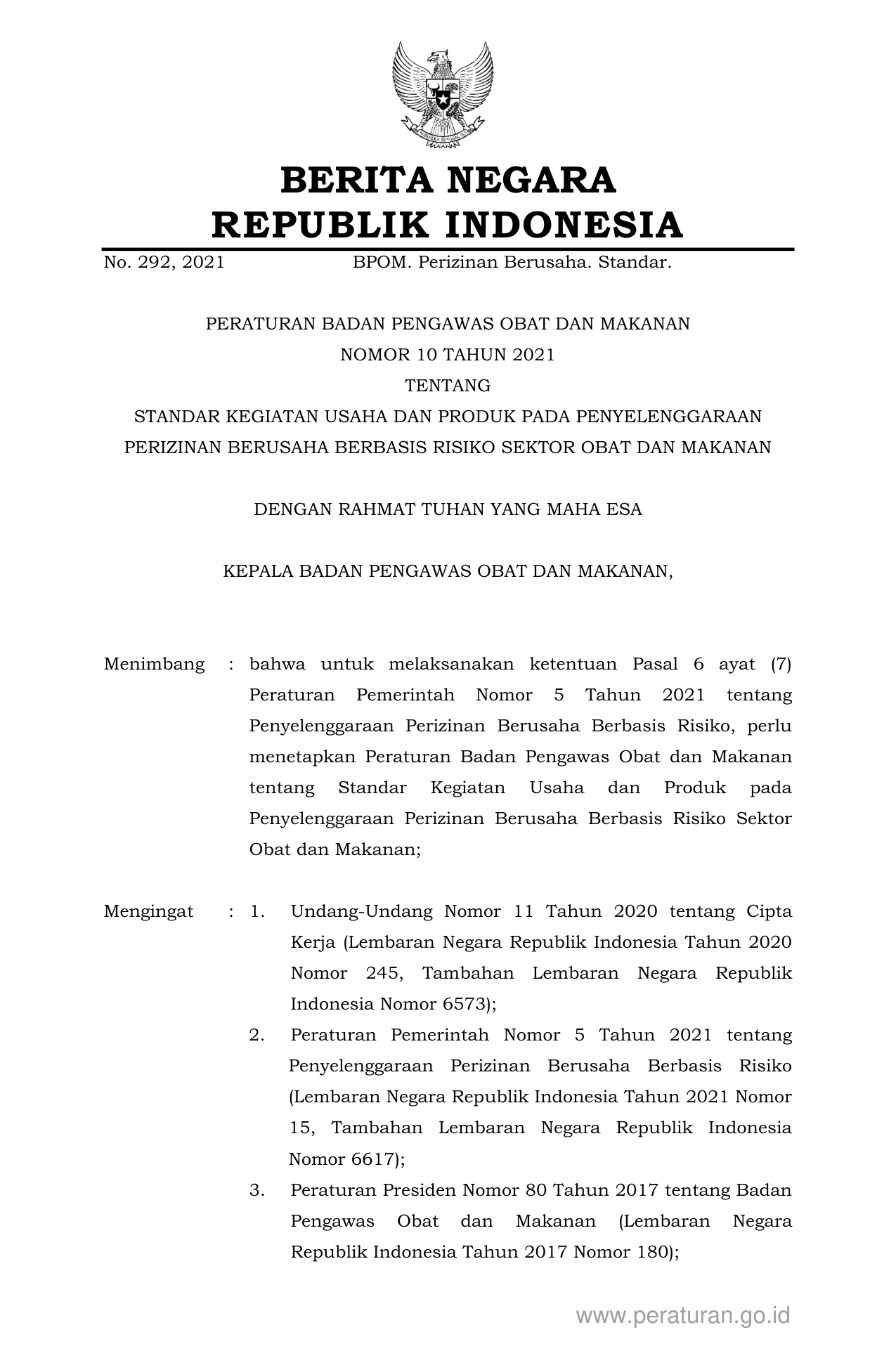PERBAN Nomor 10 Tahun 2021 | Peraturan Badan Nomor 10 Tahun 2021 tentang STANDAR KEGIATAN USAHA DAN PRODUK PADA PENYELENGGARAAN PERIZINAN BERUSAHA BERBASIS RISIKO SEKTOR OBAT DAN MAKANAN