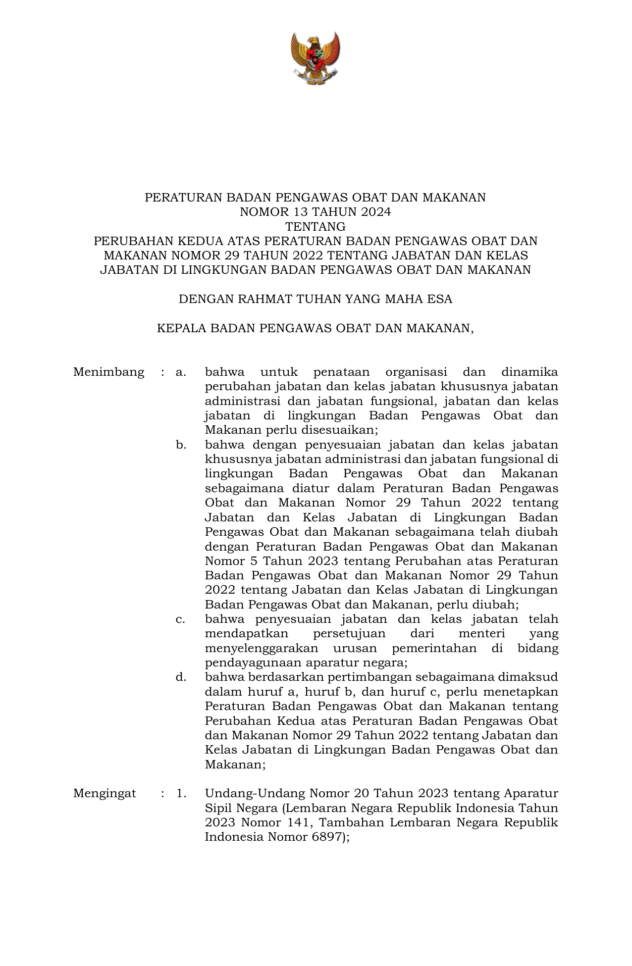 PERBAN Nomor 13 Tahun 2024 | Peraturan Badan Nomor 13 Tahun 2024 tentang Perubahan Kedua atas Peraturan Badan Pengawas Obat dan Makanan Nomor 29 Tahun 2022 tentang Jabatan dan Kelas Jabatan di Lingkungan Badan Pengawas Obat dan Makanan