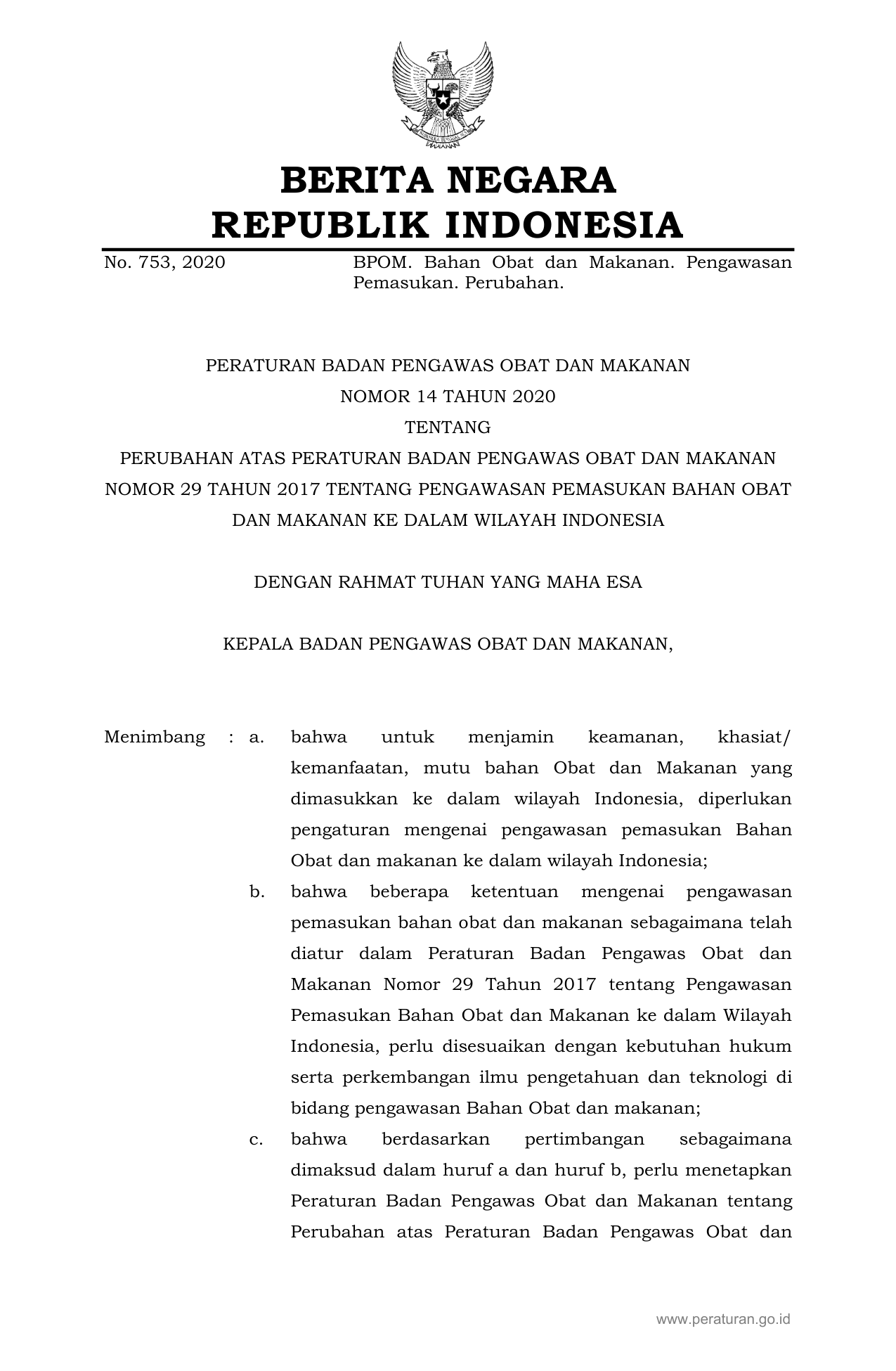 PERBAN Nomor 14 Tahun 2020 | Peraturan Badan Nomor 14 Tahun 2020 tentang PERUBAHAN ATAS PERATURAN BADAN PENGAWAS OBAT DAN MAKANAN NOMOR 29 TAHUN 2017 TENTANG PENGAWASAN PEMASUKAN BAHAN OBAT DAN MAKANAN KE DALAM WILAYAH INDONESIA