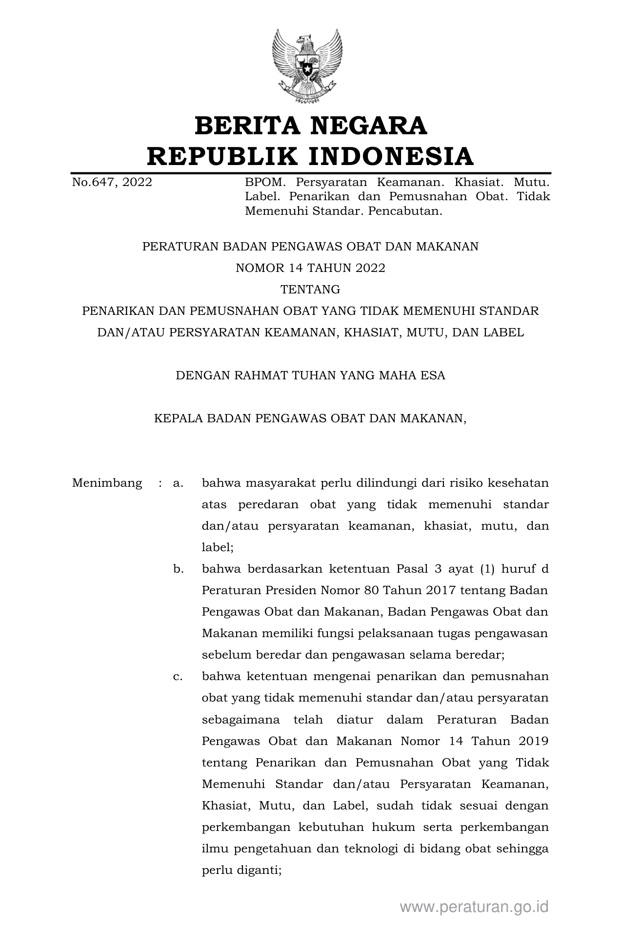 PERBAN Nomor 14 Tahun 2022 | Peraturan Badan Nomor 14 Tahun 2022 tentang PENARIKAN DAN PEMUSNAHAN OBAT YANG TIDAK MEMENUHI STANDAR DAN/ATAU PERSYARATAN KEAMANAN, KHASIAT, MUTU, DAN LABEL
