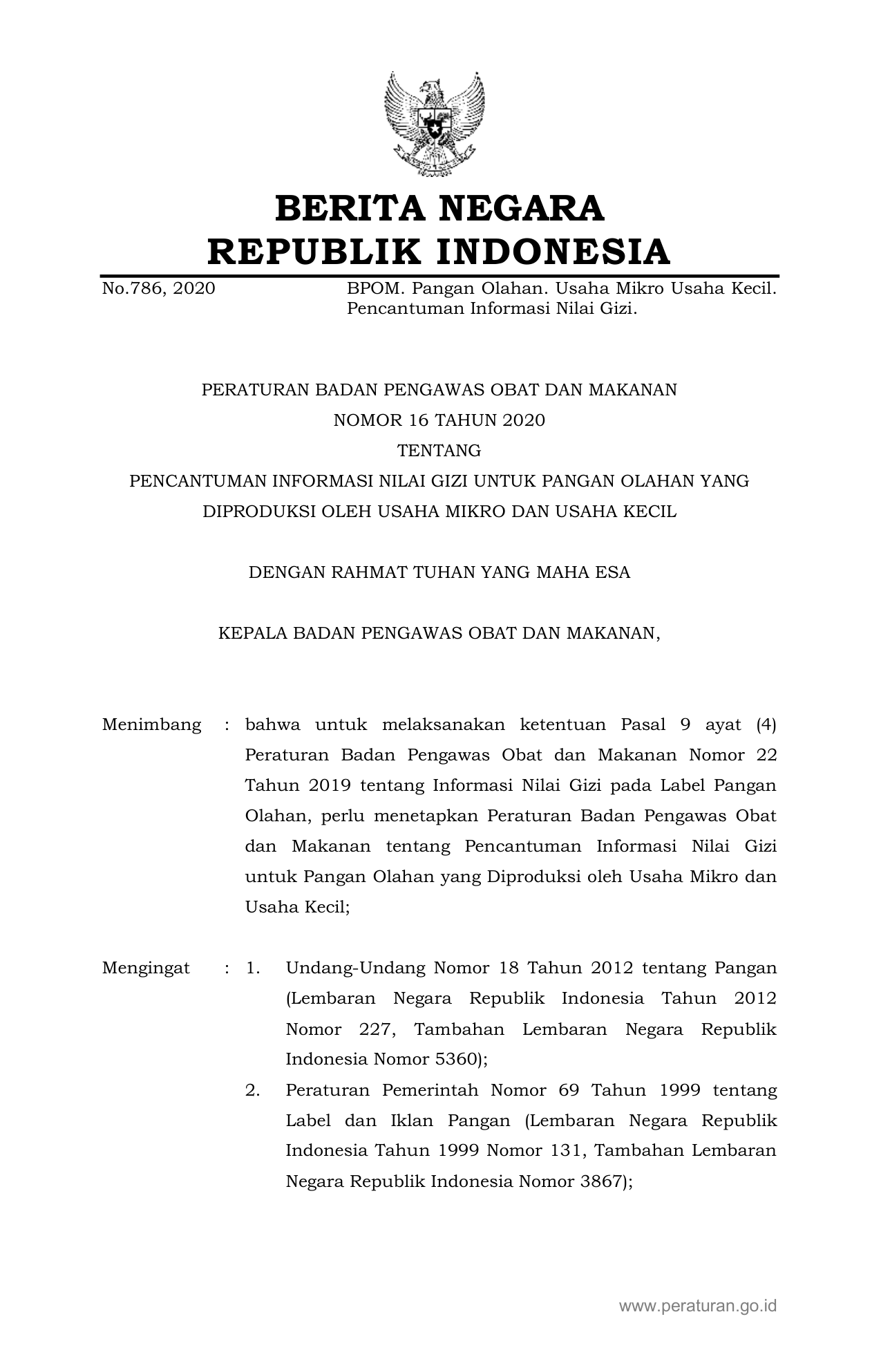 PERBAN Nomor 16 Tahun 2020 | Peraturan Badan Nomor 16 Tahun 2020 tentang PENCANTUMAN INFORMASI NILAI GIZI UNTUK PANGAN OLAHAN YANG DIPRODUKSI OLEH USAHA MIKRO DAN USAHA KECIL