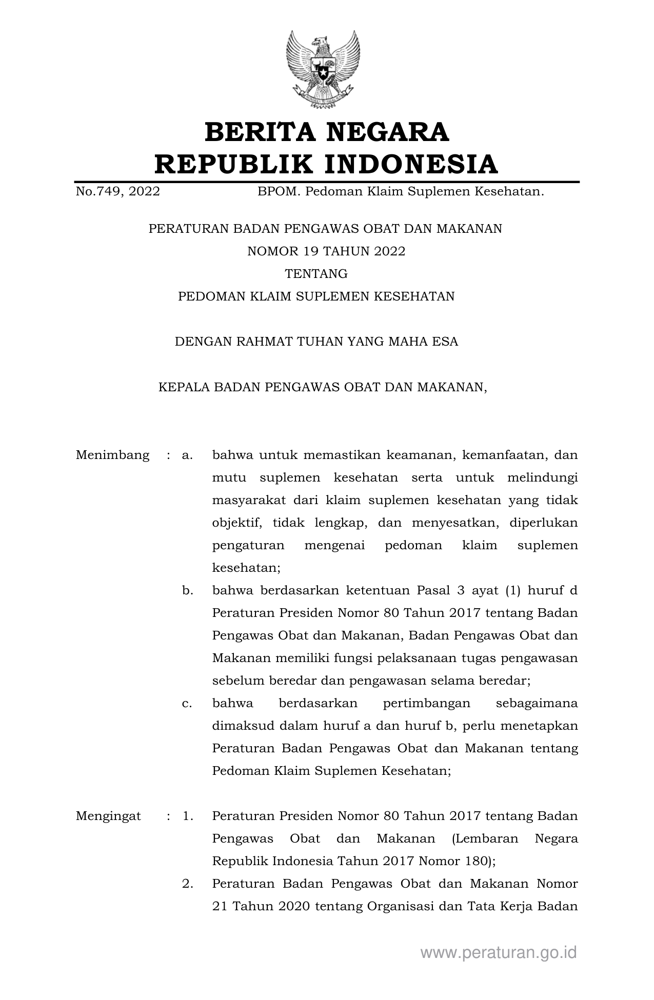 PERBAN Nomor 19 Tahun 2022 | Peraturan Badan Nomor 19 Tahun 2022 tentang PEDOMAN KLAIM SUPLEMEN KESEHATAN