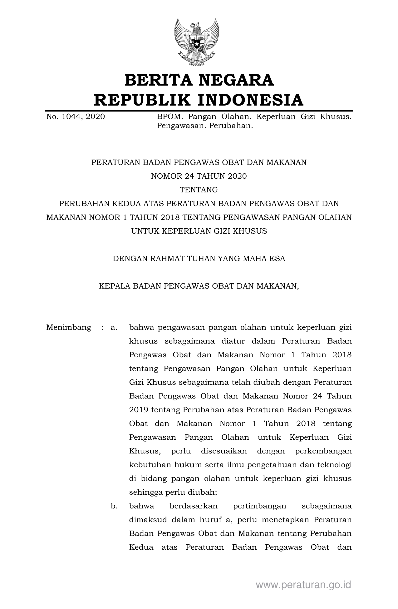 PERBAN Nomor 24 Tahun 2020 | Peraturan Badan Nomor 24 Tahun 2020 tentang PERUBAHAN KEDUA ATAS PERATURAN BADAN PENGAWAS OBAT DAN MAKANAN NOMOR 1 TAHUN 2018 TENTANG PENGAWASAN PANGAN OLAHAN UNTUK KEPERLUAN GIZI KHUSUS