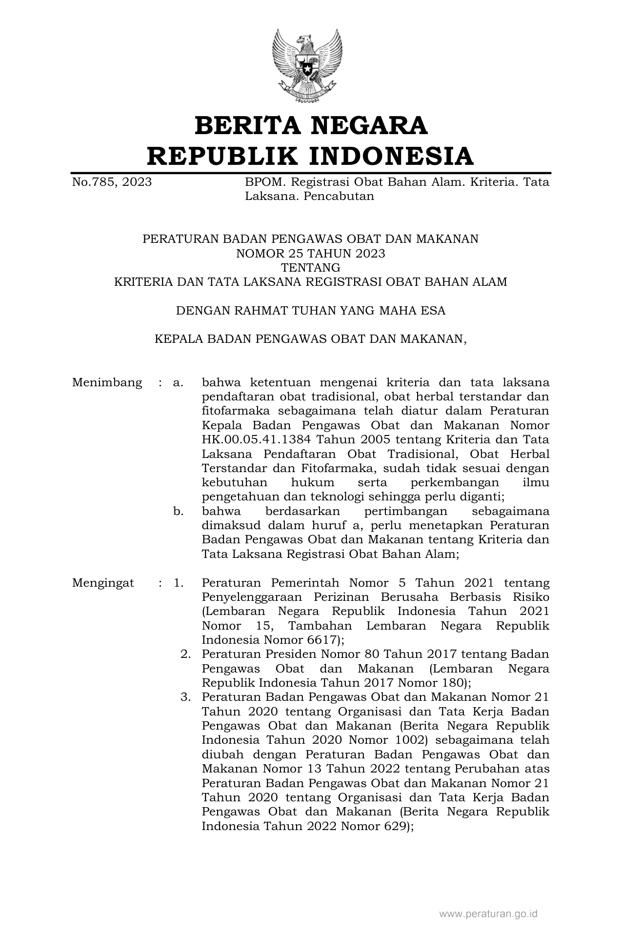 PERBAN Nomor 25 Tahun 2023 | Peraturan Badan Nomor 25 Tahun 2023 tentang KRITERIA DAN TATA LAKSANA REGISTRASI OBAT BAHAN ALAM