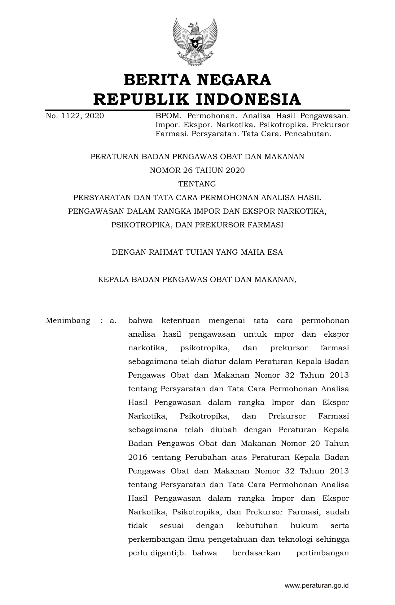PERBAN Nomor 26 Tahun 2020 | Peraturan Badan Nomor 26 Tahun 2020 tentang PERSYARATAN DAN TATA CARA PERMOHONAN ANALISA HASIL PENGAWASAN DALAM RANGKA IMPOR DAN EKSPOR NARKOTIKA, PSIKOTROPIKA, DAN PREKURSOR FARMASI