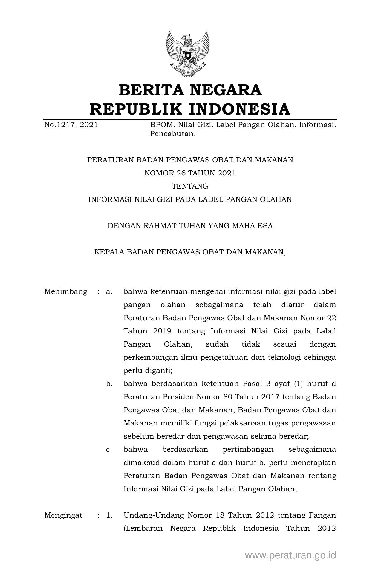 PERBAN Nomor 26 Tahun 2021 | Peraturan Badan Nomor 26 Tahun 2021 tentang INFORMASI NILAI GIZI PADA LABEL PANGAN OLAHAN