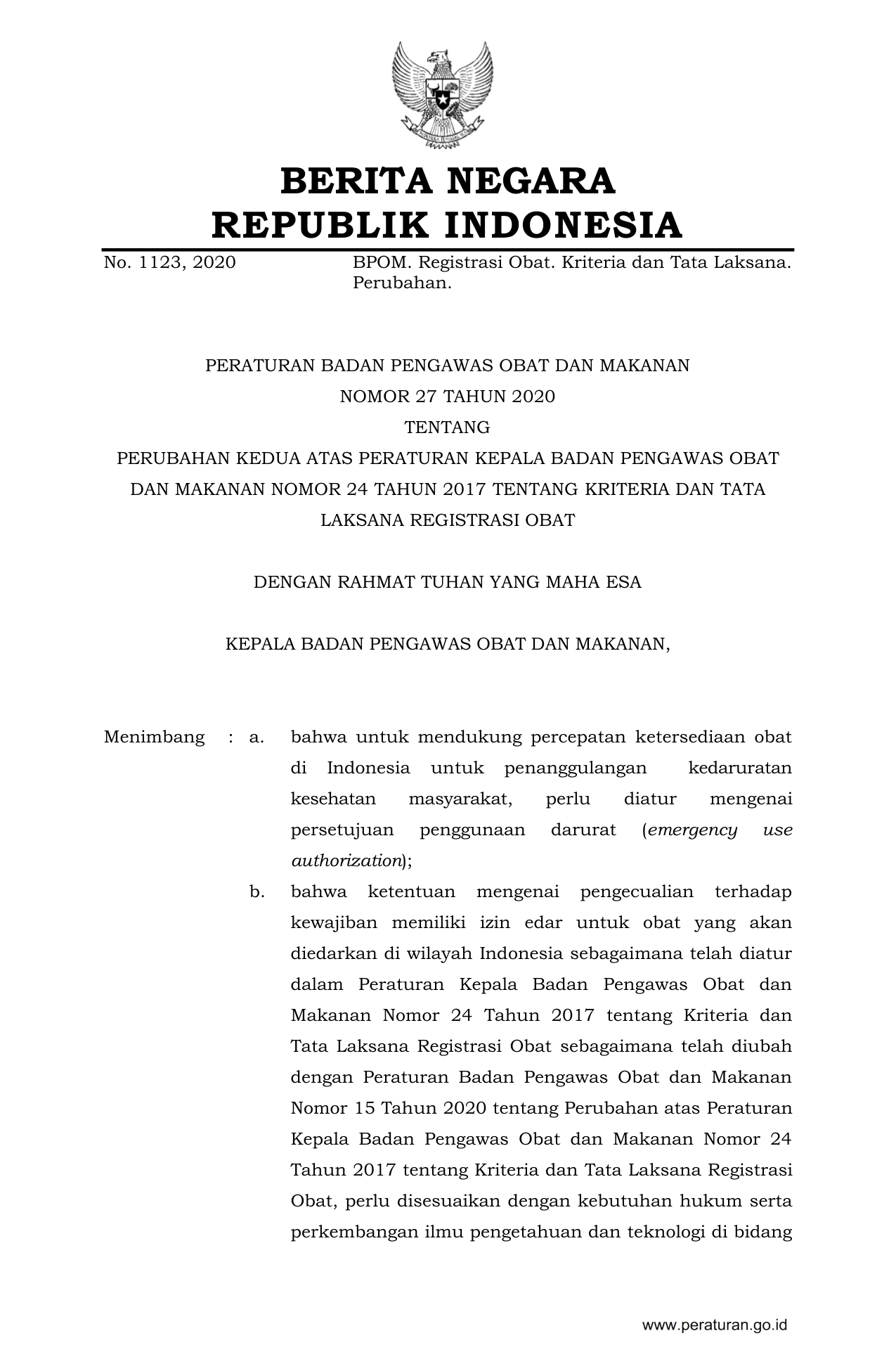 PERBAN Nomor 27 Tahun 2020 | Peraturan Badan Nomor 27 Tahun 2020 tentang PERUBAHAN KEDUA ATAS PERATURAN KEPALA BADAN PENGAWAS OBATDAN MAKANAN NOMOR 24 TAHUN 2017 TENTANG KRITERIA DAN TATA LAKSANA REGISTRASI OBAT