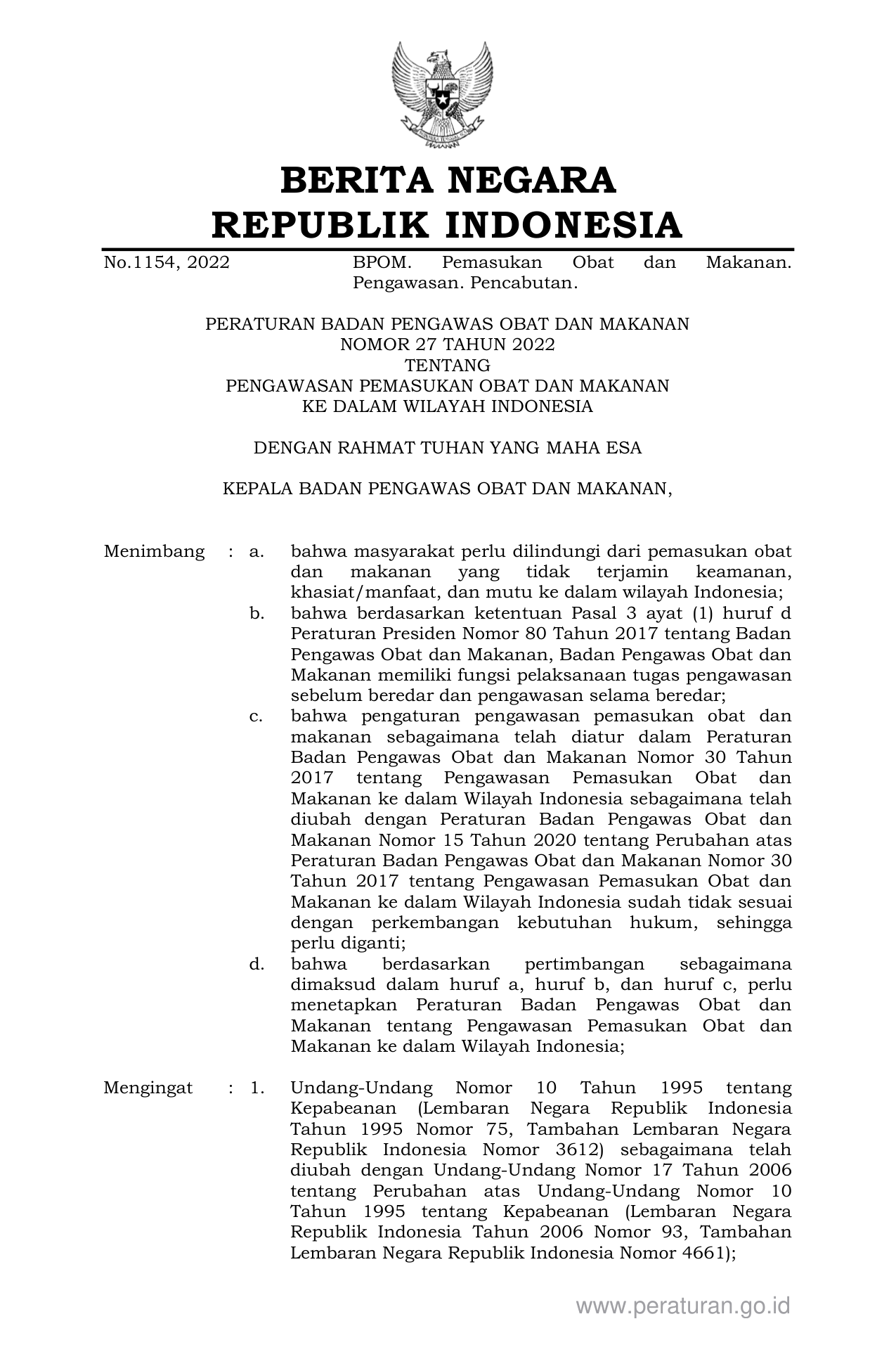PERBAN Nomor 27 Tahun 2022 | Peraturan Badan Nomor 27 Tahun 2022 tentang PENGAWASAN PEMASUKAN OBAT DAN MAKANAN KE DALAM WILAYAH INDONESIA