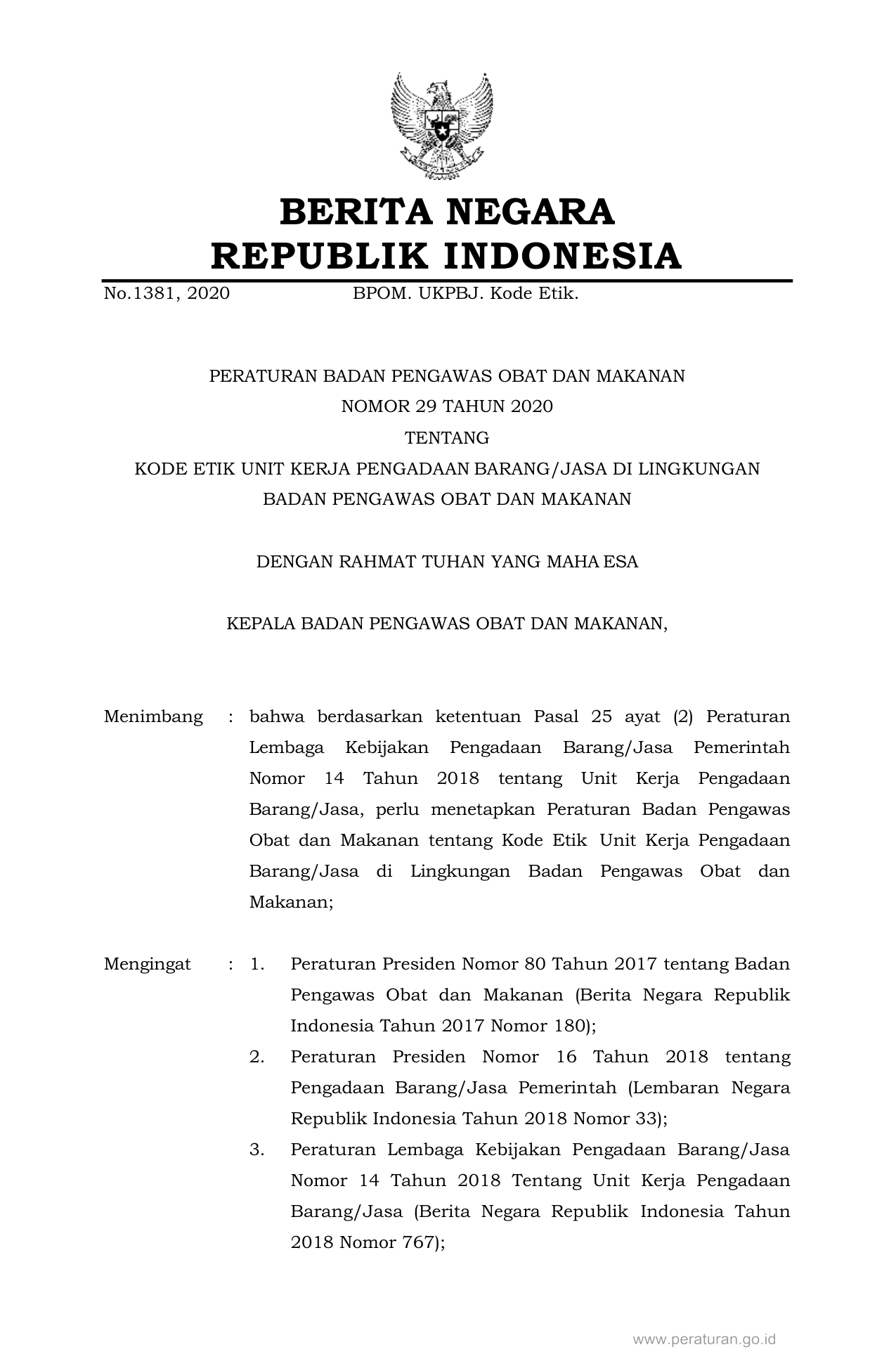 PERBAN Nomor 29 Tahun 2020 | Peraturan Badan Nomor 29 Tahun 2020 tentang KODE ETIK UNIT KERJA PENGADAAN BARANG/JASA DI LINGKUNGAN BADAN PENGAWAS OBAT DAN MAKANAN