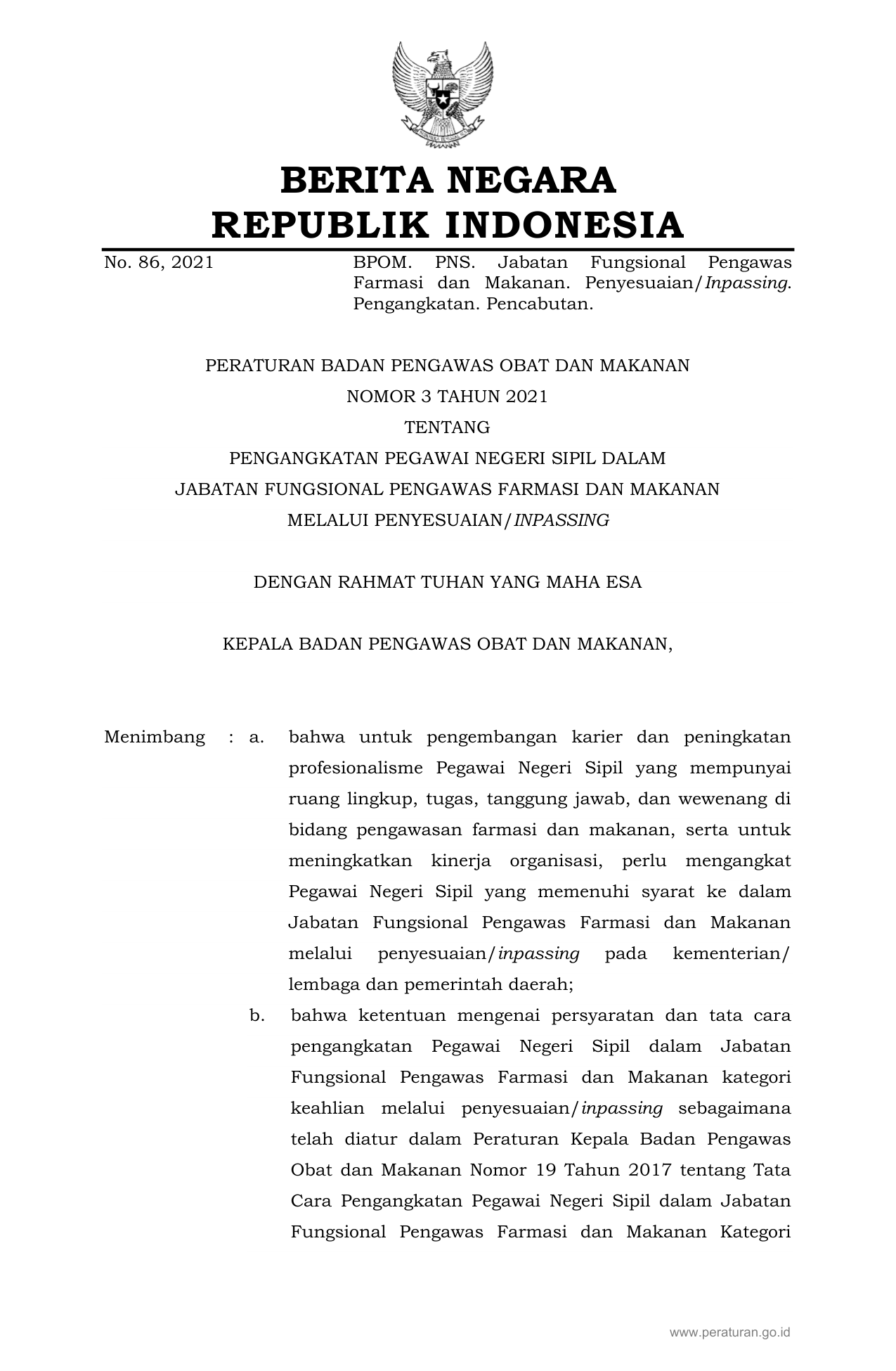 PERBAN Nomor 3 Tahun 2021 | Peraturan Badan Nomor 3 Tahun 2021 tentang PENGANGKATAN PEGAWAI NEGERI SIPIL DALAM JABATAN FUNGSIONAL PENGAWAS FARMASI DAN MAKANAN MELALUI PENYESUAIAN/INPASSING