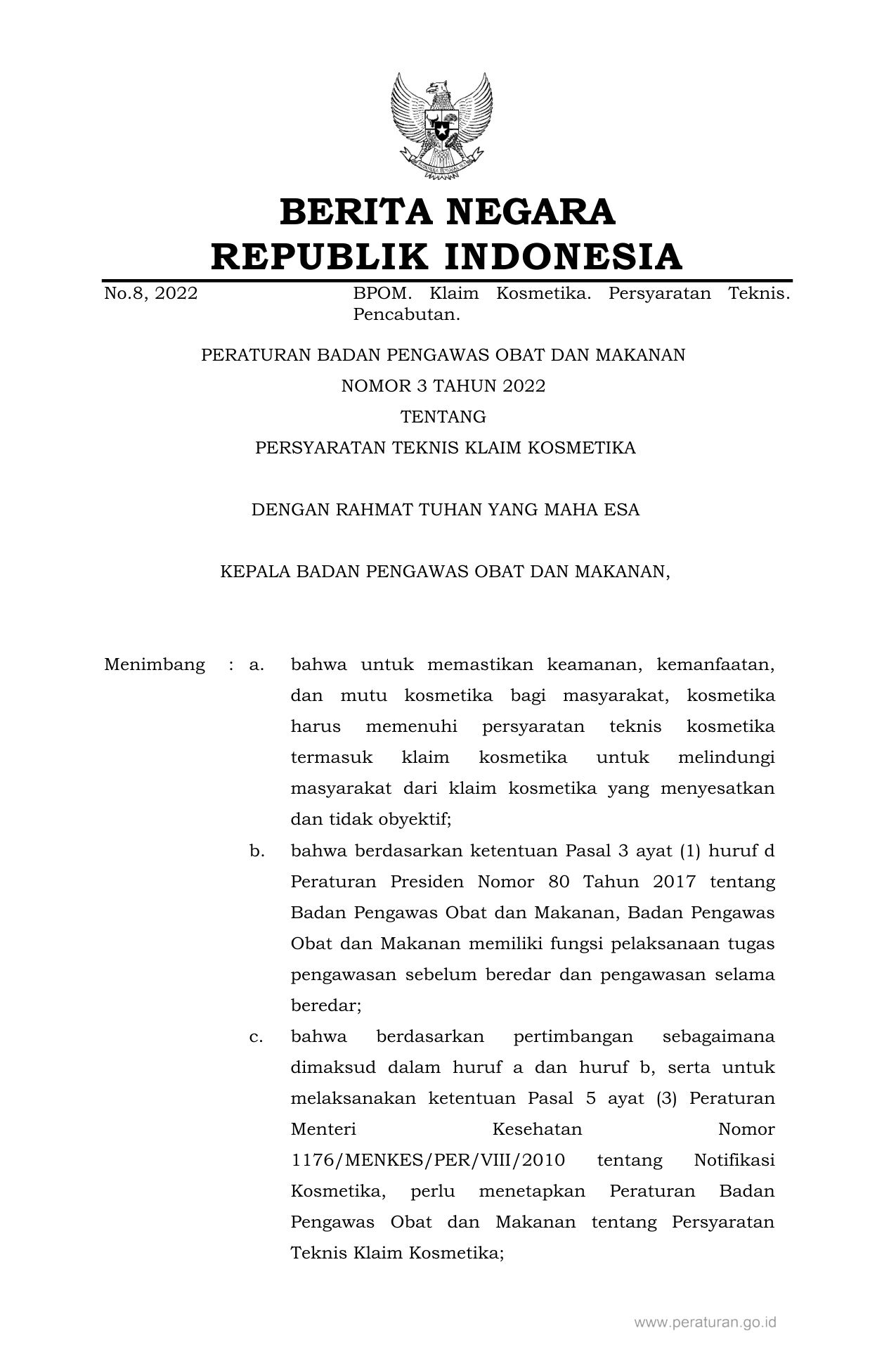 PERBAN Nomor 3 Tahun 2022 | Peraturan Badan Nomor 3 Tahun 2022 tentang PERSYARATAN TEKNIS KLAIM KOSMETIKA
