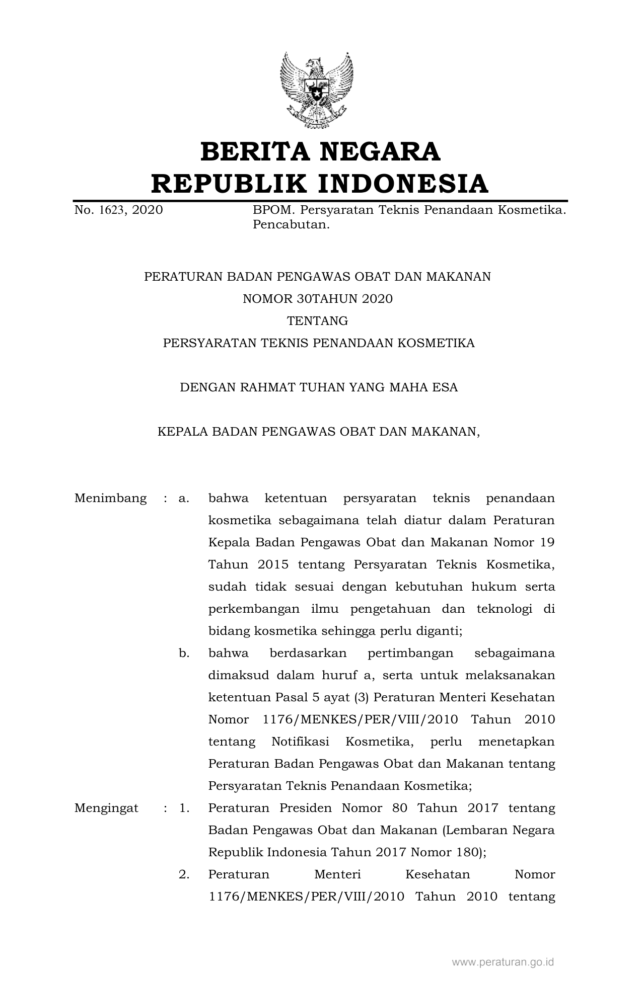 PERBAN Nomor 30 Tahun 2020 | Peraturan Badan Nomor 30 Tahun 2020 tentang PERSYARATAN TEKNIS PENANDAAN KOSMETIKA