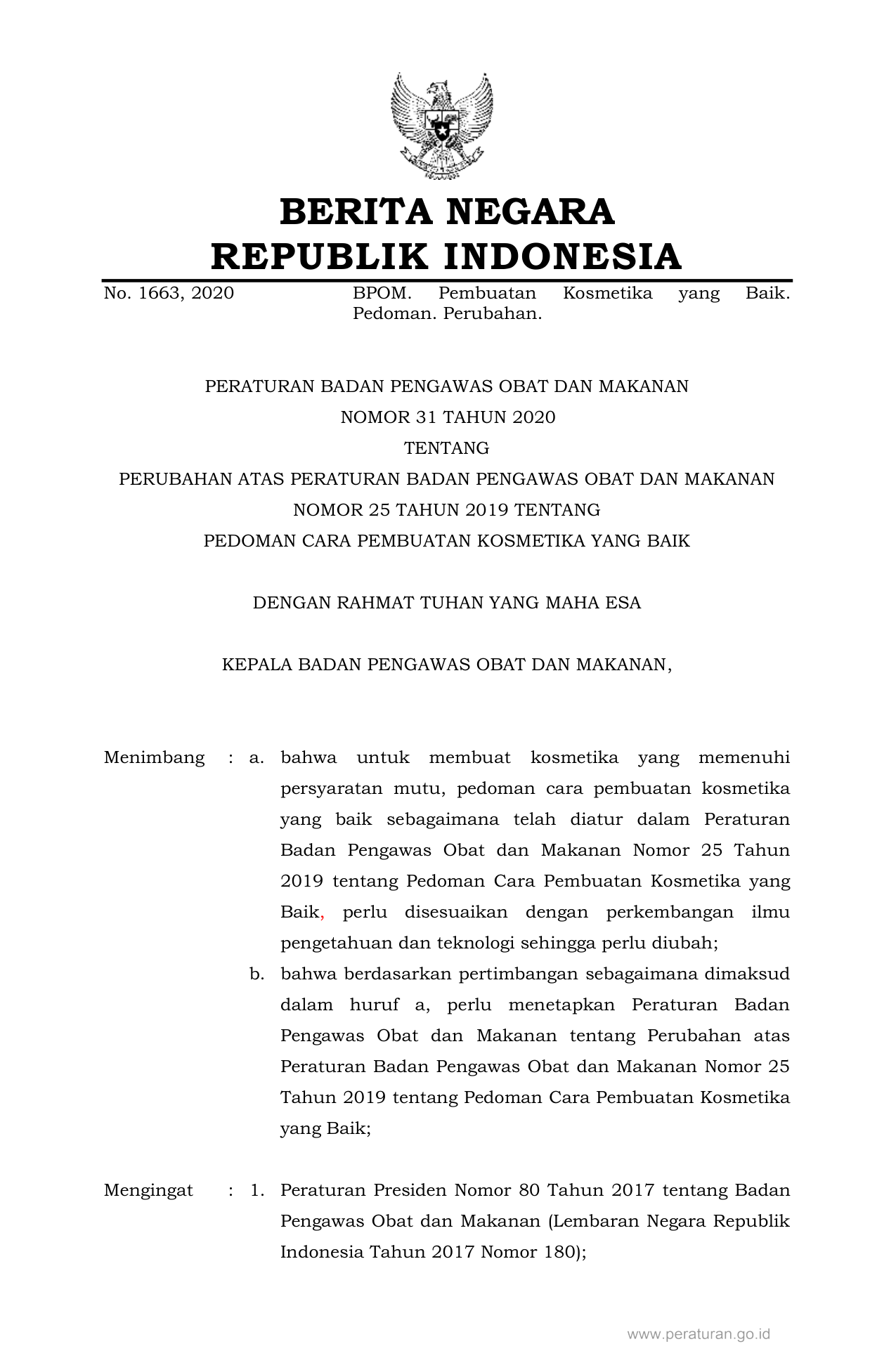PERBAN Nomor 31 Tahun 2020 | Peraturan Badan Nomor 31 Tahun 2020 tentang PERUBAHAN ATAS PERATURAN BADAN PENGAWAS OBAT DAN MAKANAN NOMOR 25 TAHUN 2019 TENTANG PEDOMAN CARA PEMBUATAN KOSMETIKA YANG BAIK