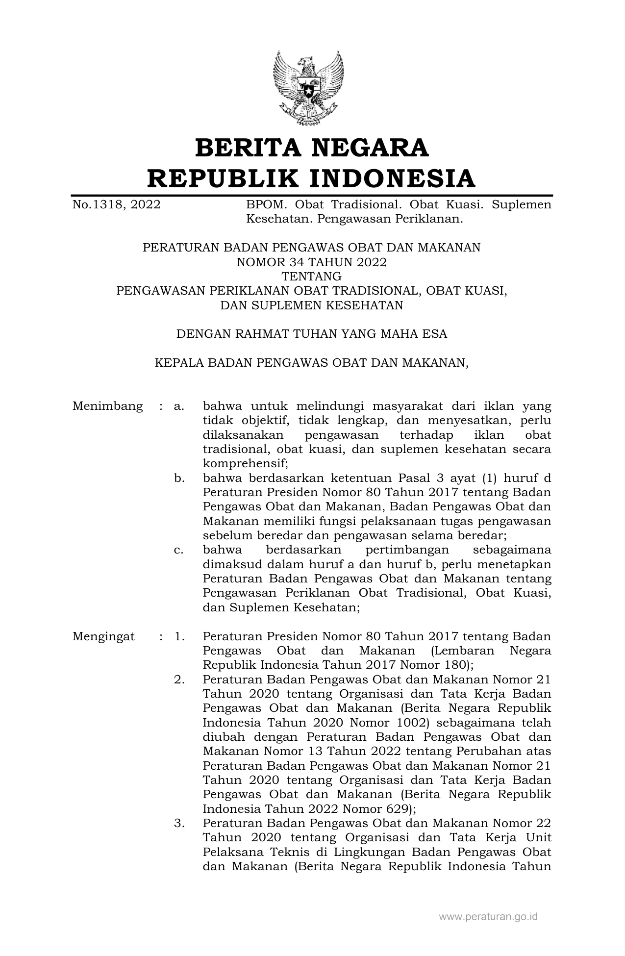 PERBAN Nomor 34 Tahun 2022 | Peraturan Badan Nomor 34 Tahun 2022 tentang PENGAWASAN PERIKLANAN OBAT TRADISIONAL, OBAT KUASI, DAN SUPLEMEN KESEHATAN