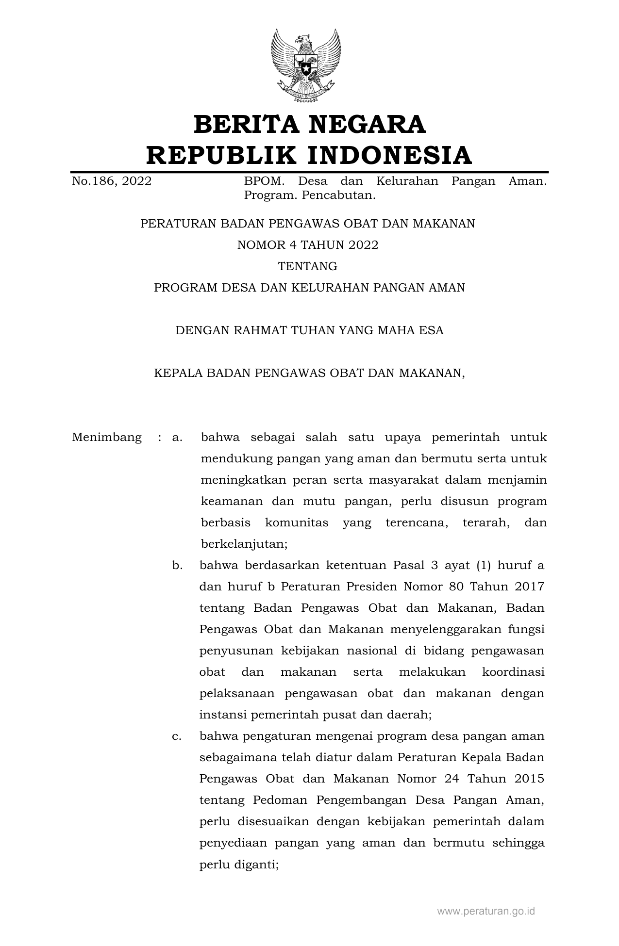 PERBAN Nomor 4 Tahun 2022 | Peraturan Badan Nomor 4 Tahun 2022 tentang PROGRAM DESA DAN KELURAHAN PANGAN AMAN