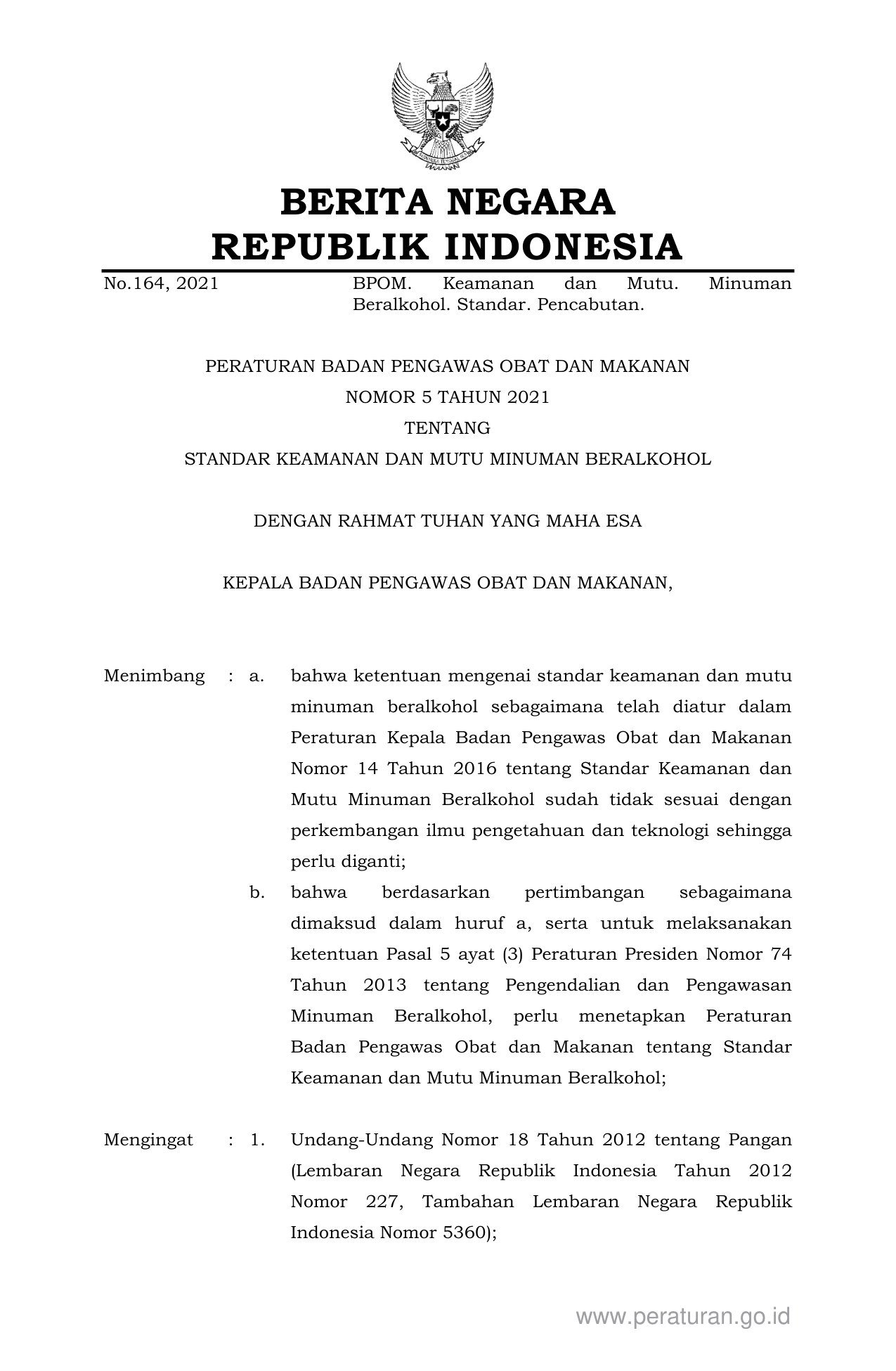PERBAN Nomor 5 Tahun 2021 | Peraturan Badan Nomor 5 Tahun 2021 tentang STANDAR KEAMANAN DAN MUTU MINUMAN BERALKOHOL