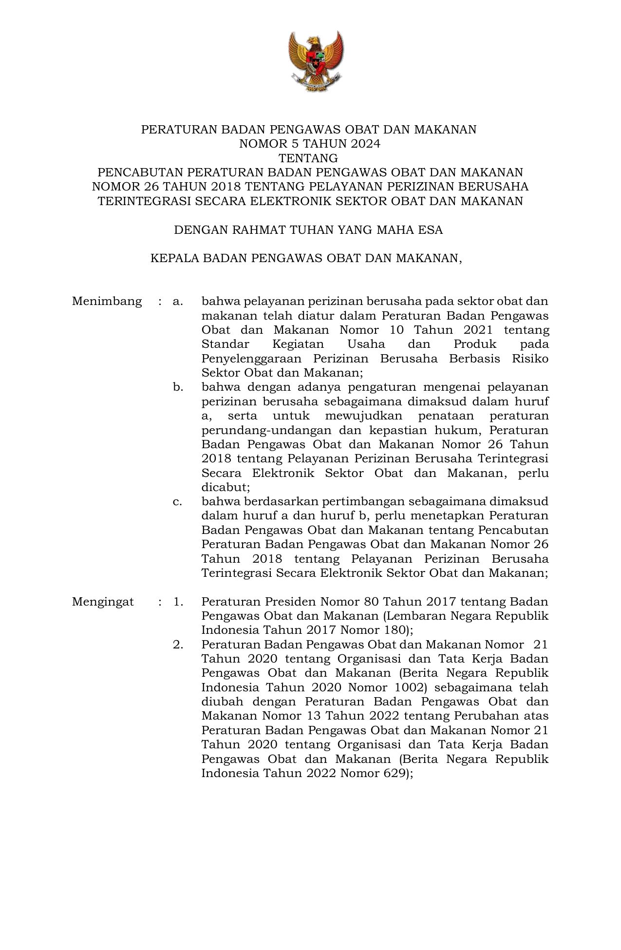 PERBAN Nomor 5 Tahun 2024 | Peraturan Badan Nomor 5 Tahun 2024 tentang PENCABUTAN PERATURAN BADAN PENGAWAS OBAT DAN MAKANAN NOMOR 26 TAHUN 2018 TENTANG PELAYANAN PERIZINAN BERUSAHA TERINTEGRASI SECARA ELEKTRONIK SEKTOR OBAT DAN MAKANAN