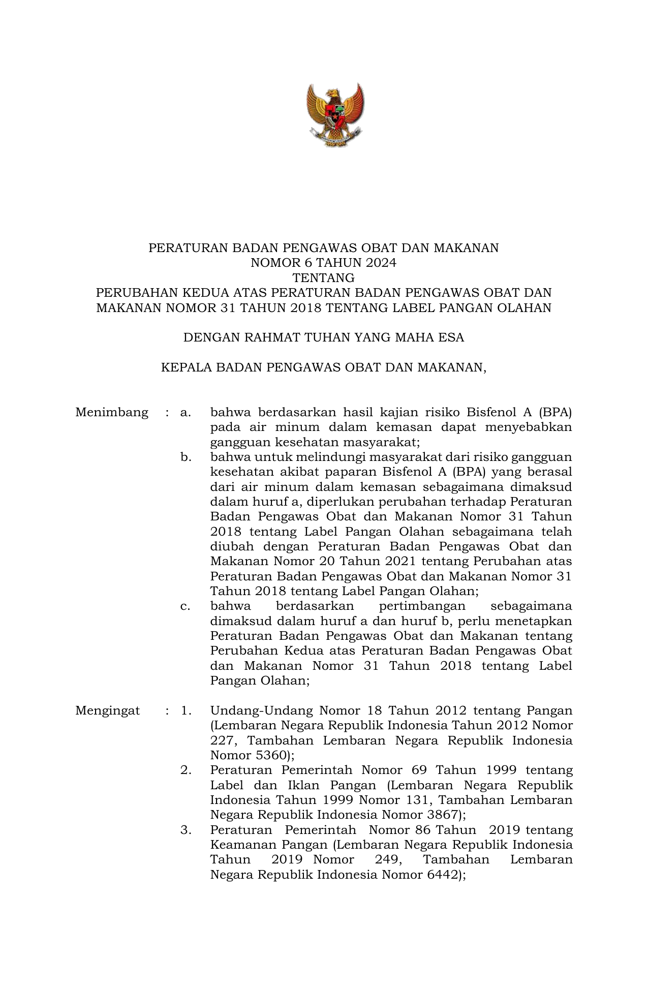 PERBAN Nomor 6 Tahun 2024 | Peraturan Badan Nomor 6 Tahun 2024 tentang PERUBAHAN KEDUA ATAS PERATURAN BADAN PENGAWAS OBAT DAN MAKANAN NOMOR 31 TAHUN 2018 TENTANG LABEL PANGAN OLAHAN