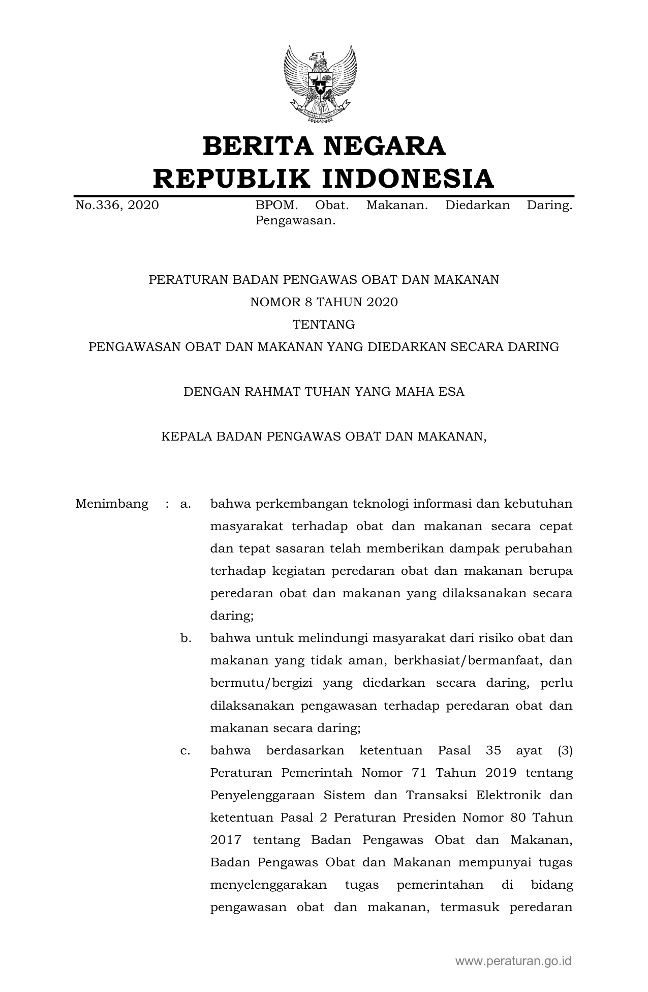 PERBAN Nomor 8 Tahun 2020 | Peraturan Badan Nomor 8 Tahun 2020 tentang PENGAWASAN OBAT DAN MAKANAN YANG DIEDARKAN SECARA DARING