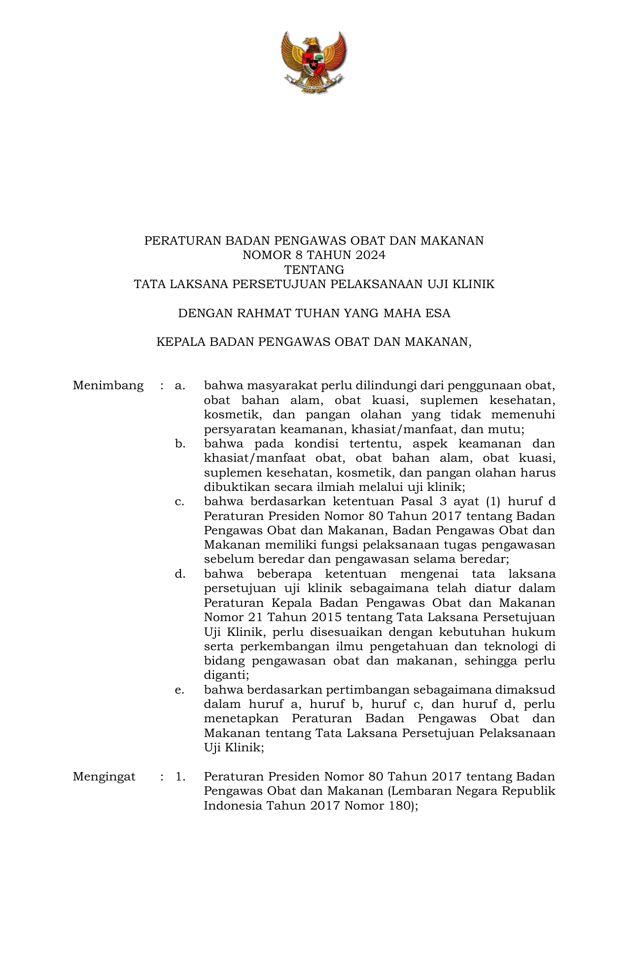 PERBAN Nomor 8 Tahun 2024 | Peraturan Badan Nomor 8 Tahun 2024 tentang Tata Laksana Persetujuan Pelaksanaan Uji Klinik