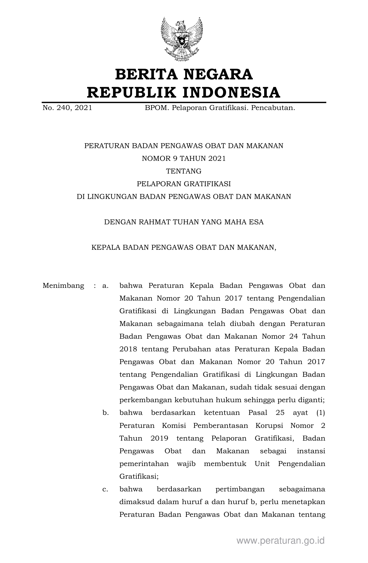 PERBAN Nomor 9 Tahun 2021 | Peraturan Badan Nomor 9 Tahun 2021 tentang PELAPORAN GRATIFIKASI DI LINGKUNGAN BADAN PENGAWAS OBAT DAN MAKANAN