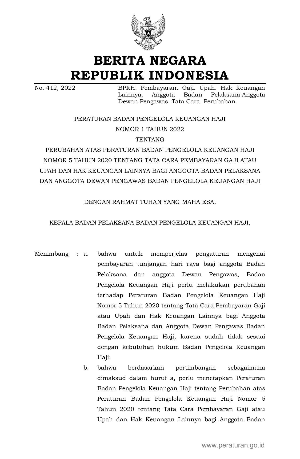 PERBAN Nomor 1 Tahun 2022 | Peraturan Badan Nomor 1 Tahun 2022 tentang PERUBAHAN ATAS PERATURAN BADAN PENGELOLA KEUANGAN HAJI NOMOR 5 TAHUN 2020 TENTANG TATA CARA PEMBAYARAN GAJI ATAU UPAH DAN HAK KEUANGAN LAINNYA BAGI ANGGOTA BADAN PELAKSANA DAN ANGGOTA DEWAN PENGAWAS BADAN PENGELOLA KEUANGAN HAJI