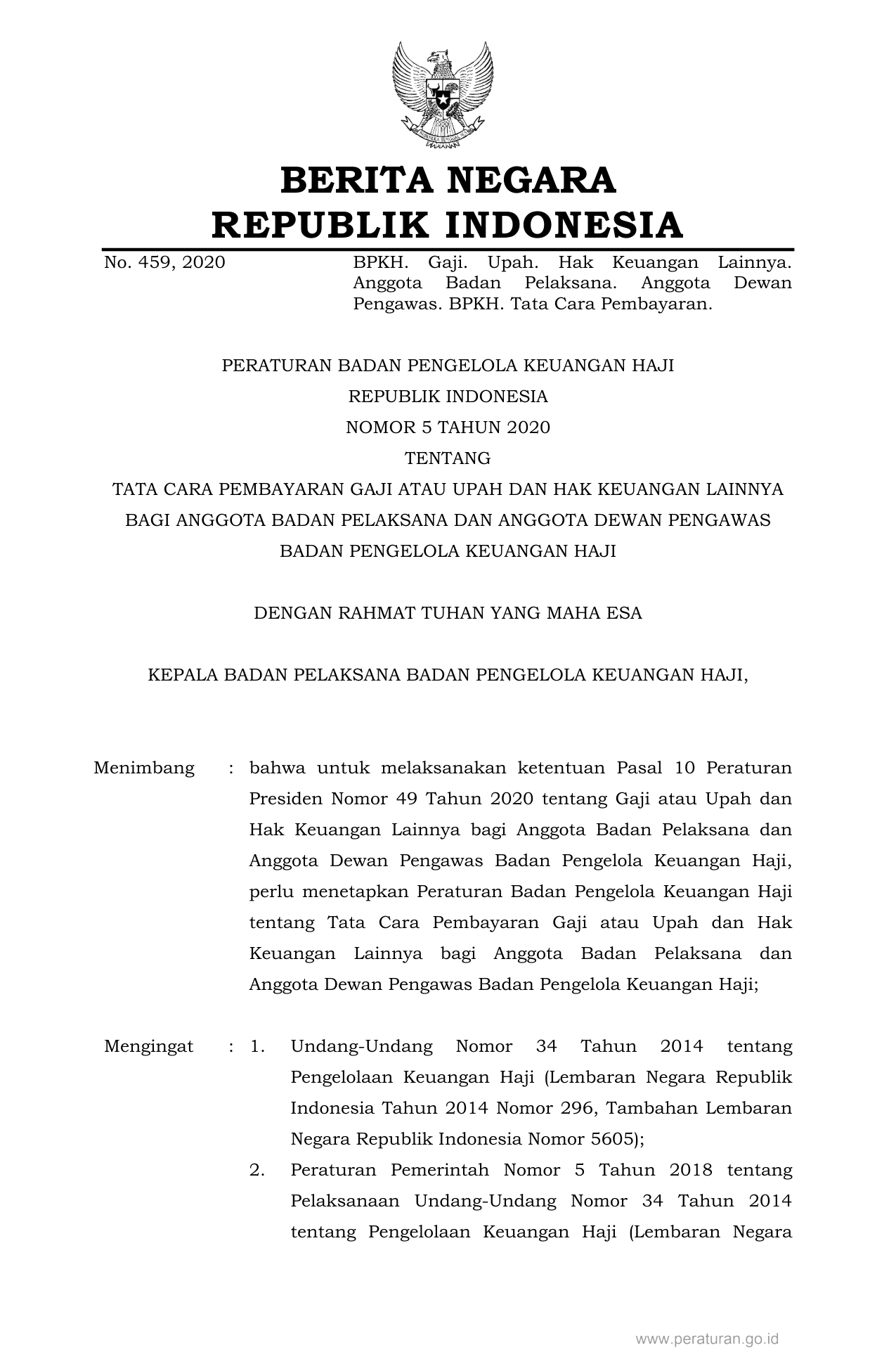 PERBAN Nomor 5 Tahun 2020 | Peraturan Badan Nomor 5 Tahun 2020 tentang TATA CARA PEMBAYARAN GAJI ATAU UPAH DAN HAK KEUANGAN LAINNYA BAGI ANGGOTA BADAN PELAKSANA DAN ANGGOTA DEWAN PENGAWAS BADAN PENGELOLA KEUANGAN HAJI