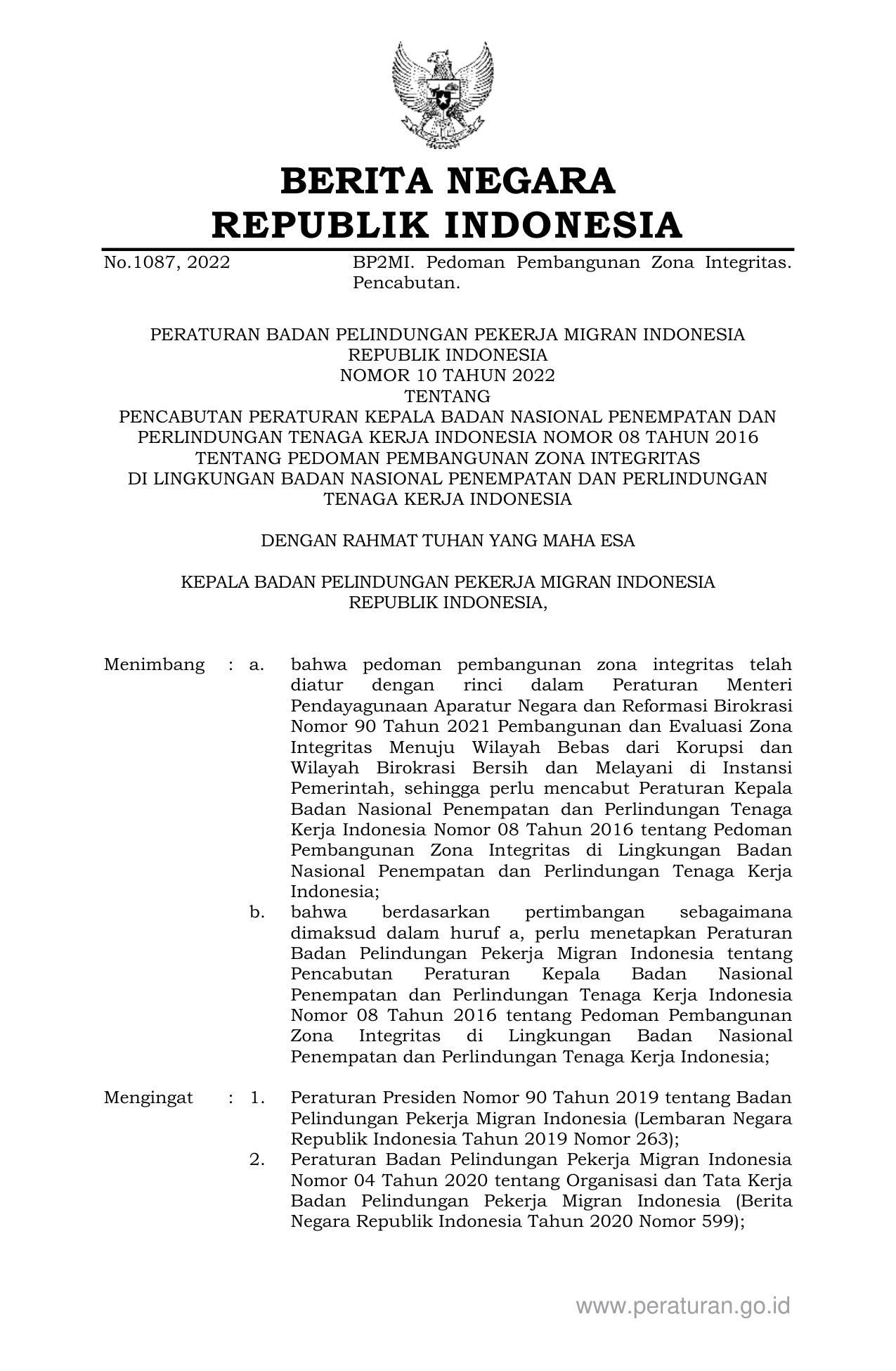 PERBAN Nomor 10 Tahun 2022 | Peraturan Badan Nomor 10 Tahun 2022 tentang PENCABUTAN PERATURAN KEPALA BADAN NASIONAL PENEMPATAN DAN PERLINDUNGAN TENAGA KERJA INDONESIA NOMOR 08 TAHUN 2016 TENTANG PEDOMAN PEMBANGUNAN ZONA INTEGRITAS DI LINGKUNGAN BADAN NASIONAL PENEMPATAN DAN PERLINDUNGAN TENAGA KERJA INDONESIA
