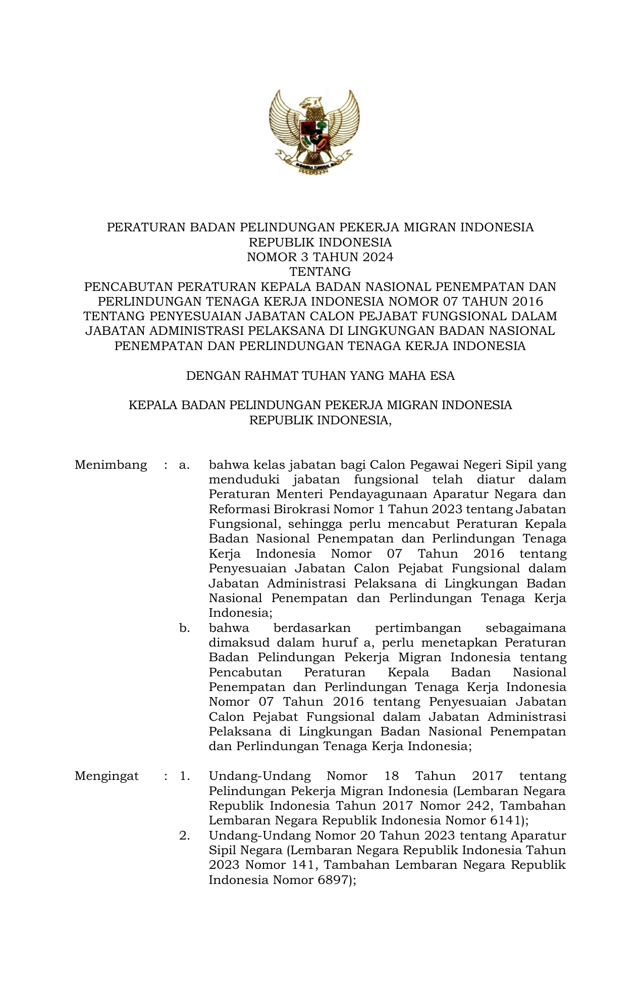 PERBAN Nomor 3 Tahun 2024 | Peraturan Badan Nomor 3 Tahun 2024 tentang Pencabutan Peraturan Kepala Badan Nasional Penempatan dan Perlindungan Tenaga Kerja Indonesia Nomor 07 Tahun 2016 tentang Penyesuaian Jabatan Calon Pejabat Fungsional dalam Jabatan Administrasi Pelaksana di Lingkungan Badan Nasional Penempatan dan Perlindungan Tenaga Kerja Indonesia