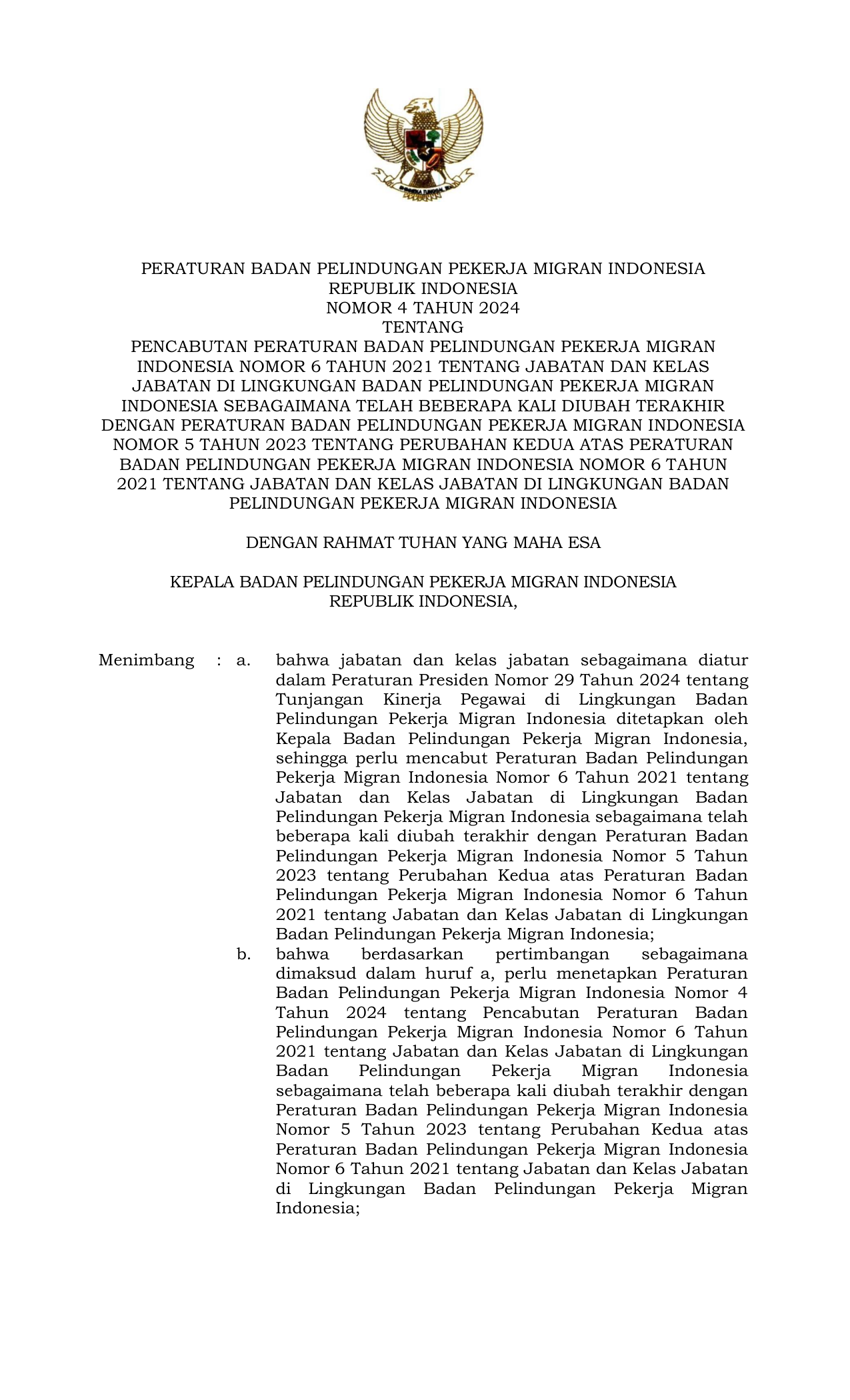 PERBAN Nomor 4 Tahun 2024 | Peraturan Badan Nomor 4 Tahun 2024 tentang Pencabutan Peraturan Badan Pelindungan Pekerja Migran Indonesia Nomor 6 Tahun 2021 tentang Jabatan dan Kelas Jabatan di Lingkungan Badan Pelindungan Pekerja Migran Indonesia sebagaimana telah beberapa kali diubah terakhir dengan Peraturan Badan Pelindungan Pekerja Migran Indonesia Nomor 5 Tahun 2023 tentang Perubahan Kedua atas Peraturan Badan Pelindungan Pekerja Migran Indonesia Nomor 6 Tahun 2021 tentang Jabatan dan Kelas Jabatan di Lingkungan Badan Pelindungan Pekerja Migran Indonesia