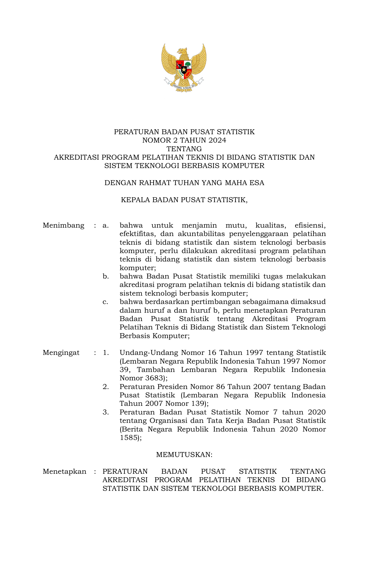 PERBAN Nomor 2 Tahun 2024 | Peraturan Badan Nomor 2 Tahun 2024 tentang Akreditasi Program Pelatihan Teknis di Bidang Statistik dan Sistem Teknologi Berbasis Komputer