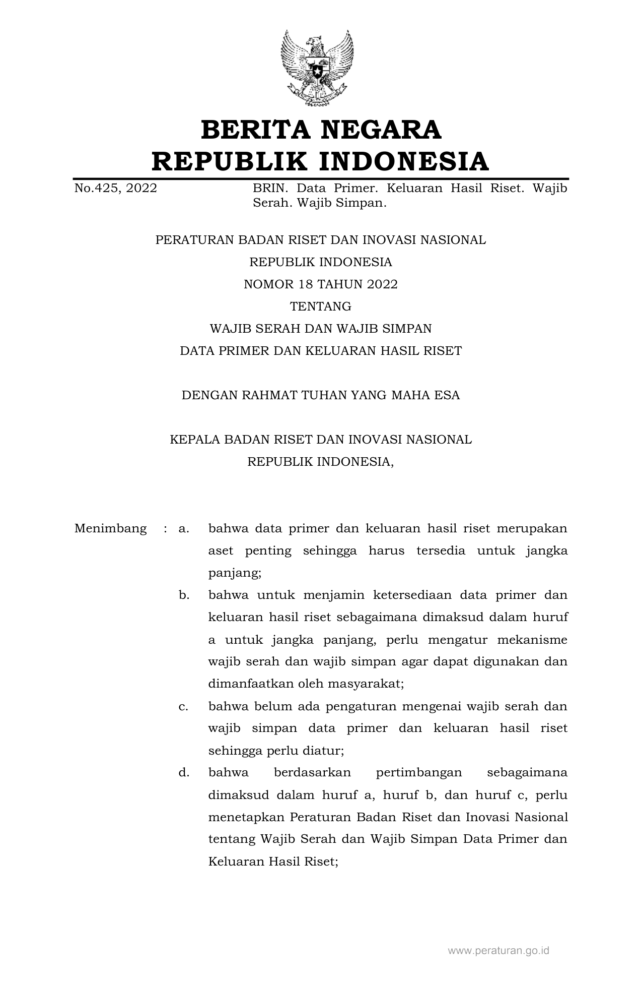 PERBAN Nomor 18 Tahun 2022 | Peraturan Badan Nomor 18 Tahun 2022 tentang WAJIB SERAH DAN WAJIB SIMPAN DATA PRIMER DAN KELUARAN HASIL RISET
