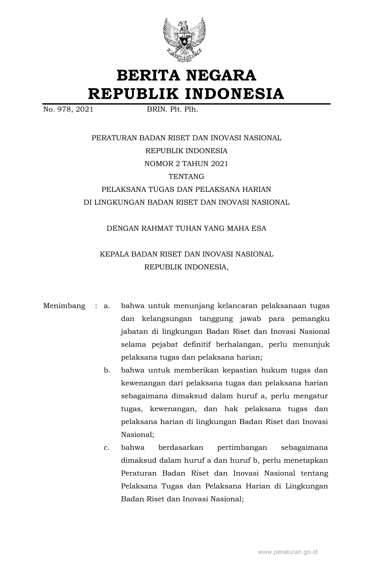 PERBAN Nomor 2 Tahun 2021 | Peraturan Badan Nomor 2 Tahun 2021 tentang PELAKSANA TUGAS DAN PELAKSANA HARIAN DI LINGKUNGAN BADAN RISET DAN INOVASI NASIONAL