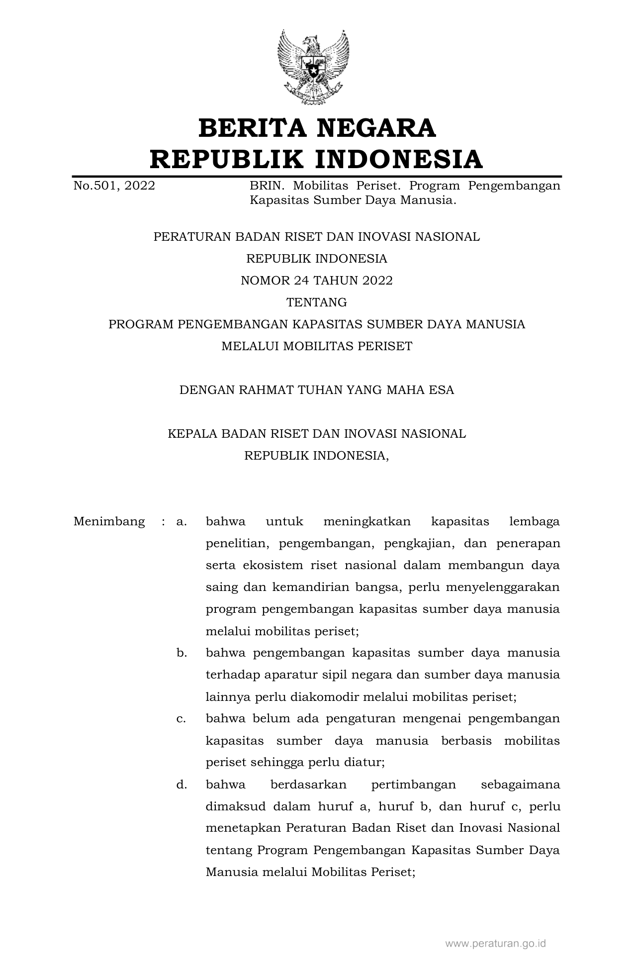 PERBAN Nomor 24 Tahun 2022 | Peraturan Badan Nomor 24 Tahun 2022 tentang PROGRAM PENGEMBANGAN KAPASITAS SUMBER DAYA MANUSIA MELALUI MOBILITAS PERISET