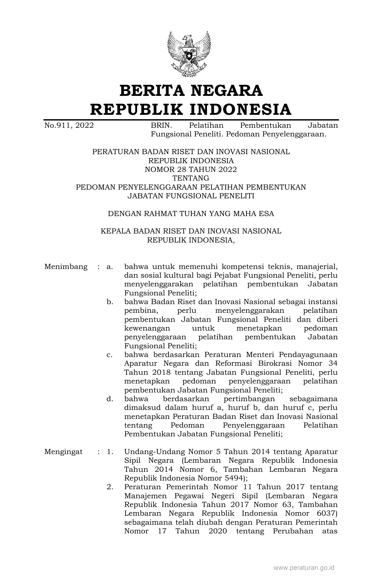 PERBAN Nomor 28 Tahun 2022 | Peraturan Badan Nomor 28 Tahun 2022 tentang PEDOMAN PENYELENGGARAAN PELATIHAN PEMBENTUKAN JABATAN FUNGSIONAL PENELITI