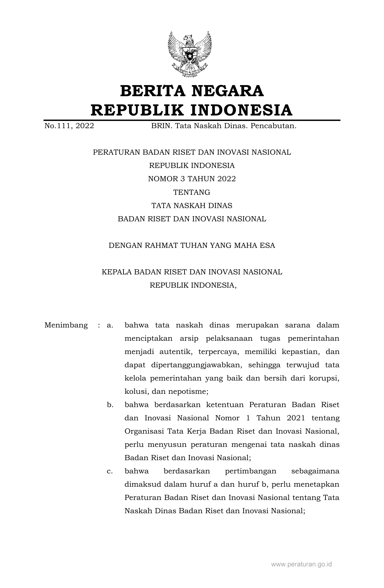 PERBAN Nomor 3 Tahun 2022 | Peraturan Badan Nomor 3 Tahun 2022 tentang TATA NASKAH DINAS BADAN RISET DAN INOVASI NASIONAL