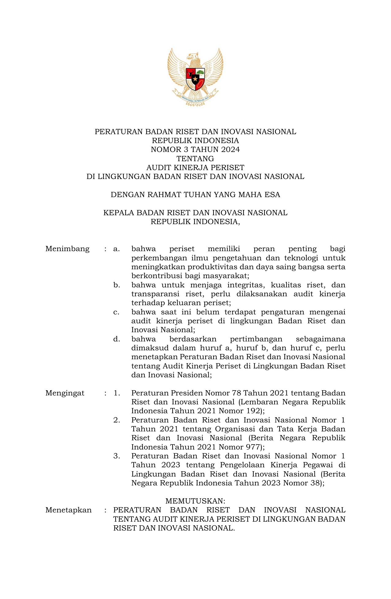 PERBAN Nomor 3 Tahun 2024 | Peraturan Badan Nomor 3 Tahun 2024 tentang Audit Kinerja Periset di Lingkungan Badan Riset dan Inovasi Nasional