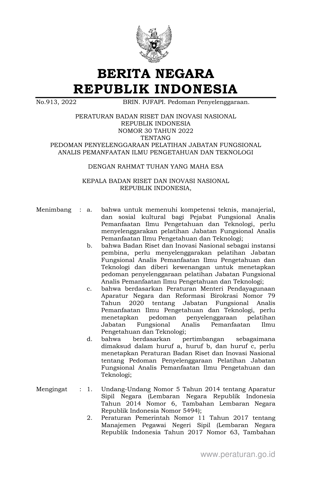 PERBAN Nomor 30 Tahun 2022 | Peraturan Badan Nomor 30 Tahun 2022 tentang PEDOMAN PENYELENGGARAAN PELATIHAN JABATAN FUNGSIONAL ANALIS PEMANFAATAN ILMU PENGETAHUAN DAN TEKNOLOGI