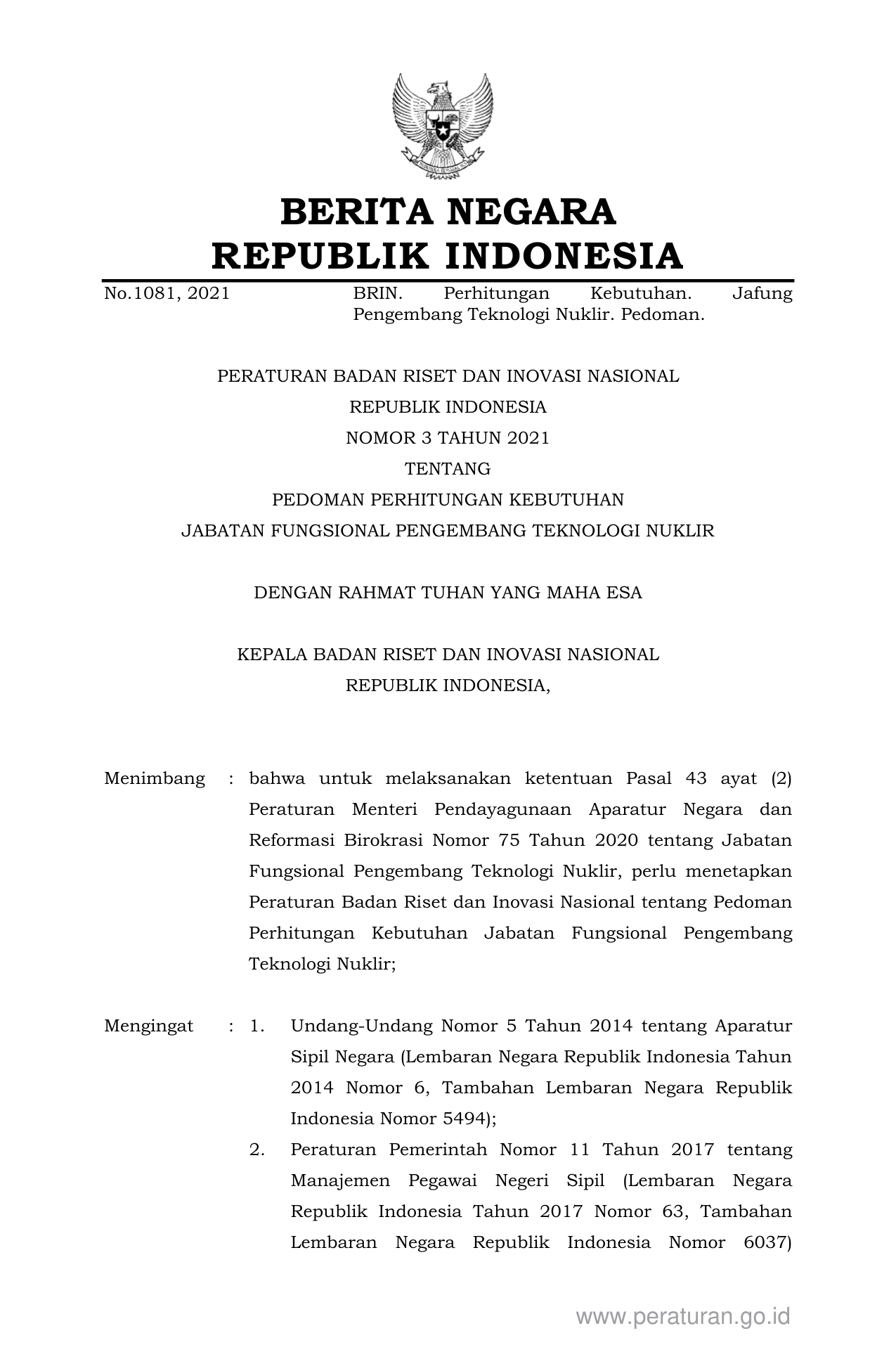 PERBAN Nomor 32 Tahun 2021 | Peraturan Badan Nomor 32 Tahun 2021 tentang PEDOMAN PERHITUNGAN KEBUTUHAN JABATAN FUNGSIONAL PENGEMBANG TEKNOLOGI NUKLIR