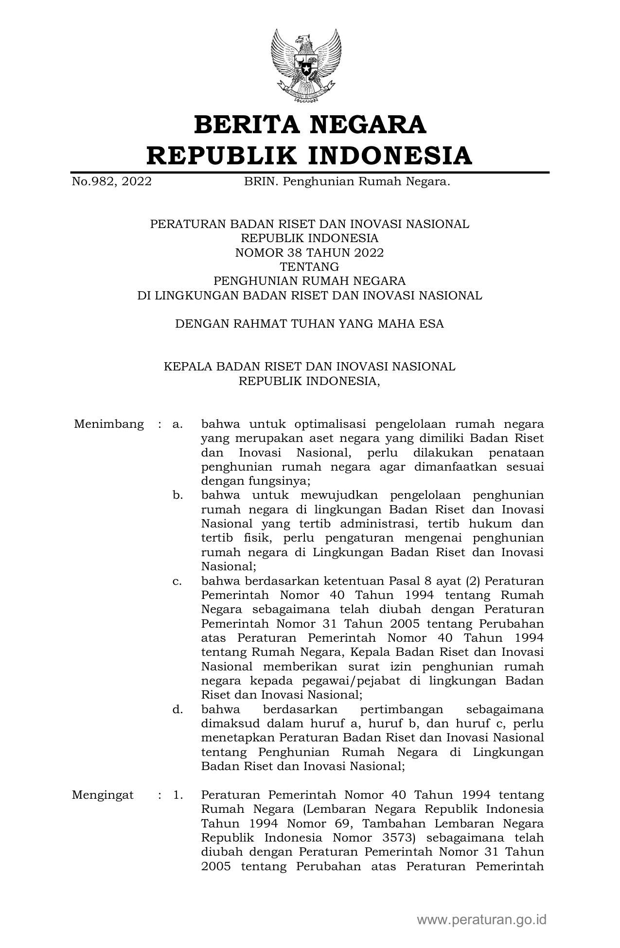 PERBAN Nomor 38 Tahun 2022 | Peraturan Badan Nomor 38 Tahun 2022 tentang PENGHUNIAN RUMAH NEGARA DI LINGKUNGAN BADAN RISET DAN INOVASI NASIONAL