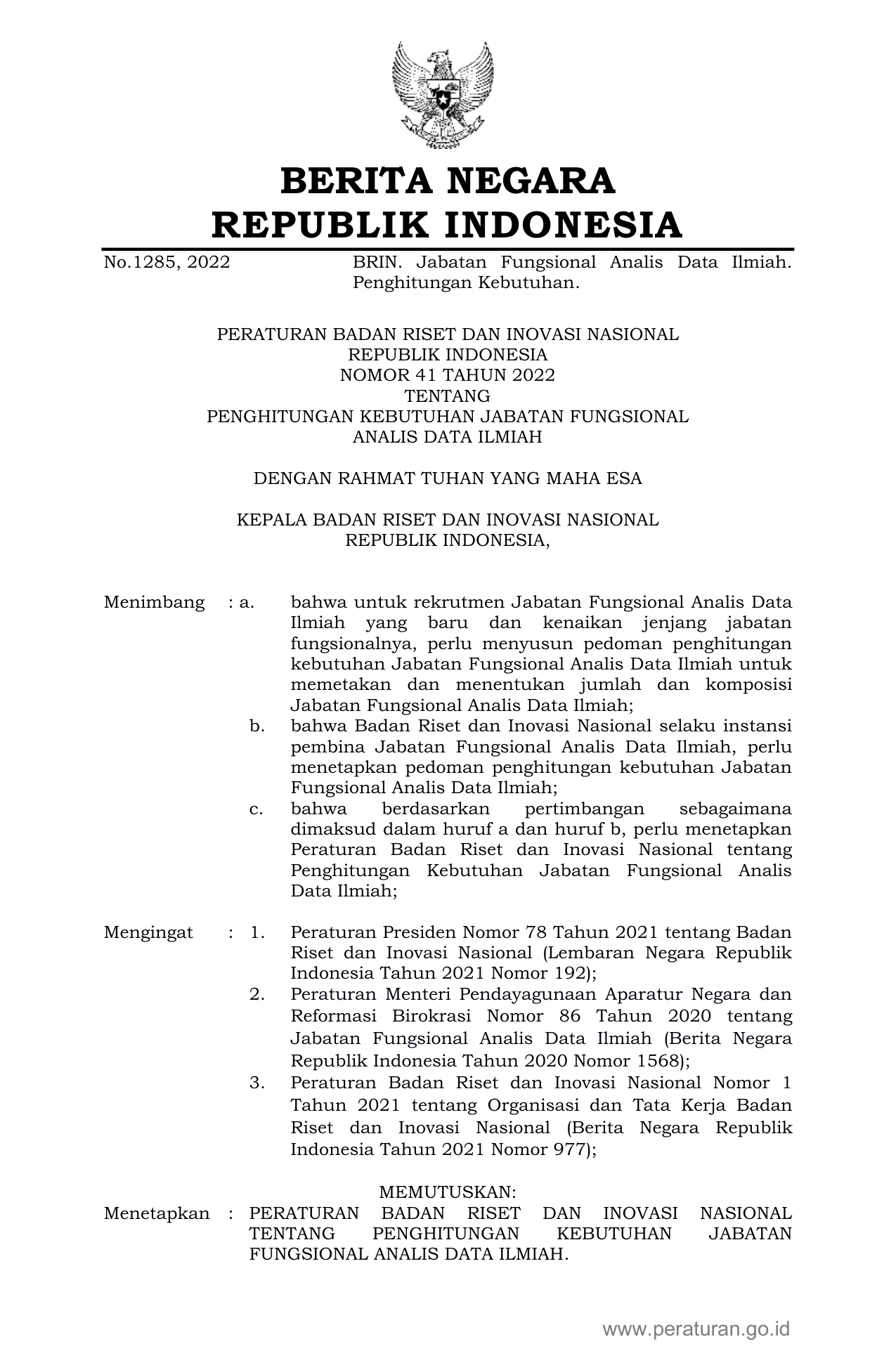 PERBAN Nomor 41 Tahun 2022 | Peraturan Badan Nomor 41 Tahun 2022 tentang PENGHITUNGAN KEBUTUHAN JABATAN FUNGSIONAL ANALIS DATA ILMIAH
