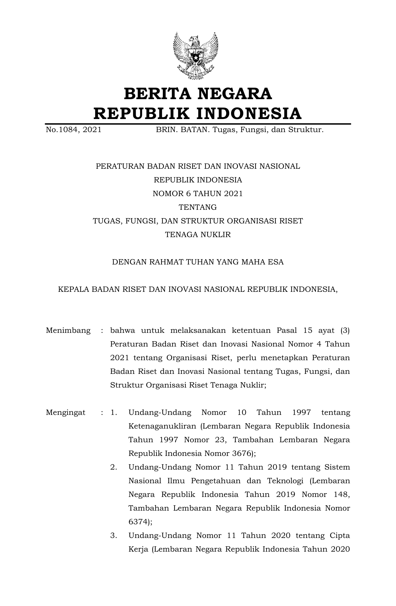 PERBAN Nomor 69 Tahun 2021 | Peraturan Badan Nomor 69 Tahun 2021 tentang TUGAS, FUNGSI, DAN STRUKTUR ORGANISASI RISET TENAGA NUKLIR